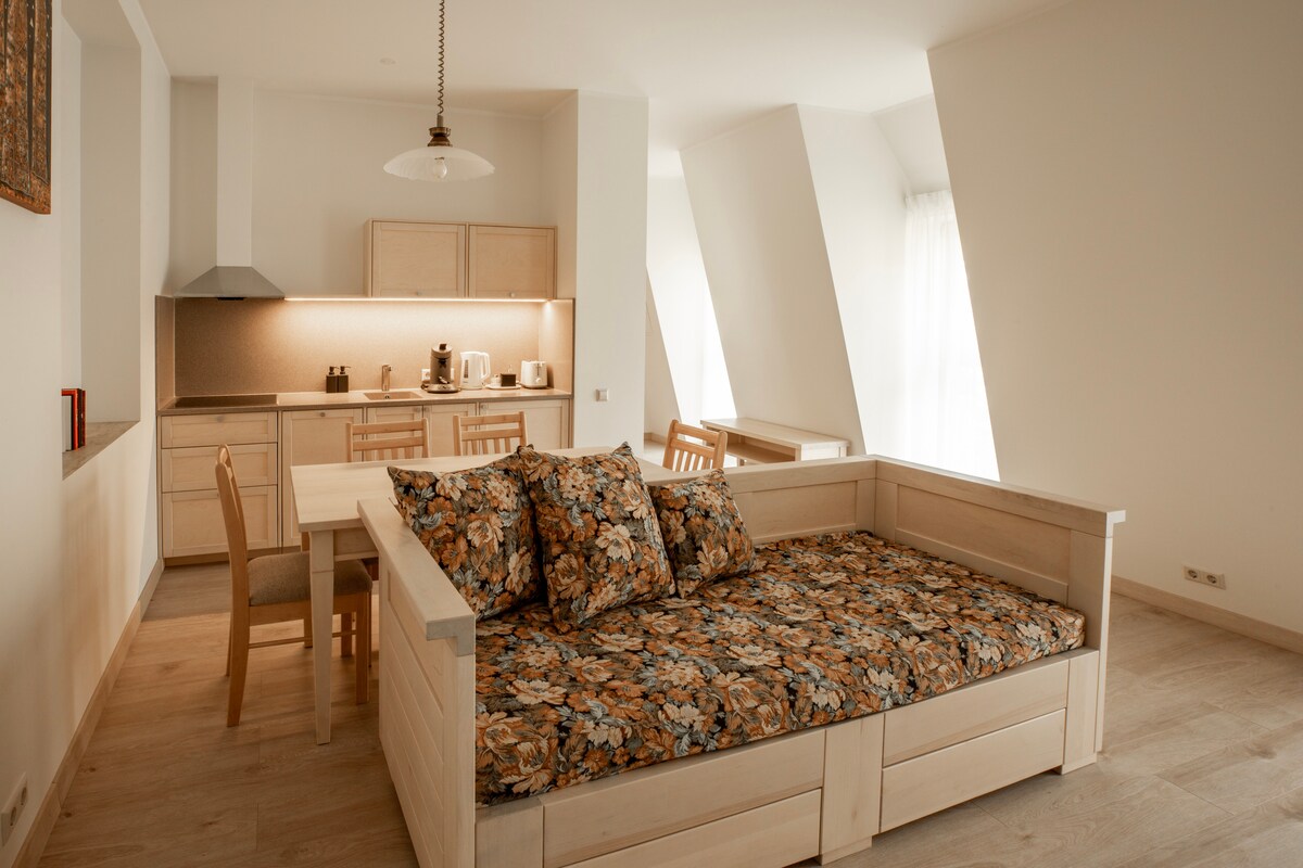 A bright and comfortable newly renovated one-bedroom apartment, thoughtfully designed by a renowned Dutch interior designer. Ideal for couples or small families looking for a relaxing stay. Located near the Daugava River and just 5 minutes from the city center by car, it offers a peaceful base for exploring Riga and the surrounding area. The apartment includes a private parking space within the fenced property and two bicycles for guest use.
