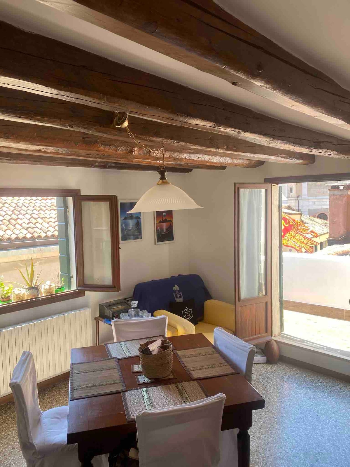 Quite fascinating space, due to a tasteful refurbishing, where each detail has been carefully designed. It Is on the second floor, under the roof beams, of a small building situated right behind the main street “ Strada nuova” . Bright, confortable, cosy and quiet. Has windows on 2 sides and overlooks roofs, a canal and an open area. At 1 min walk there are 2 supermarkets, many food shops, restaurants, pizzerie, wine bars…you could not expect more. Two waterbus stops are at 2/5 min walk.