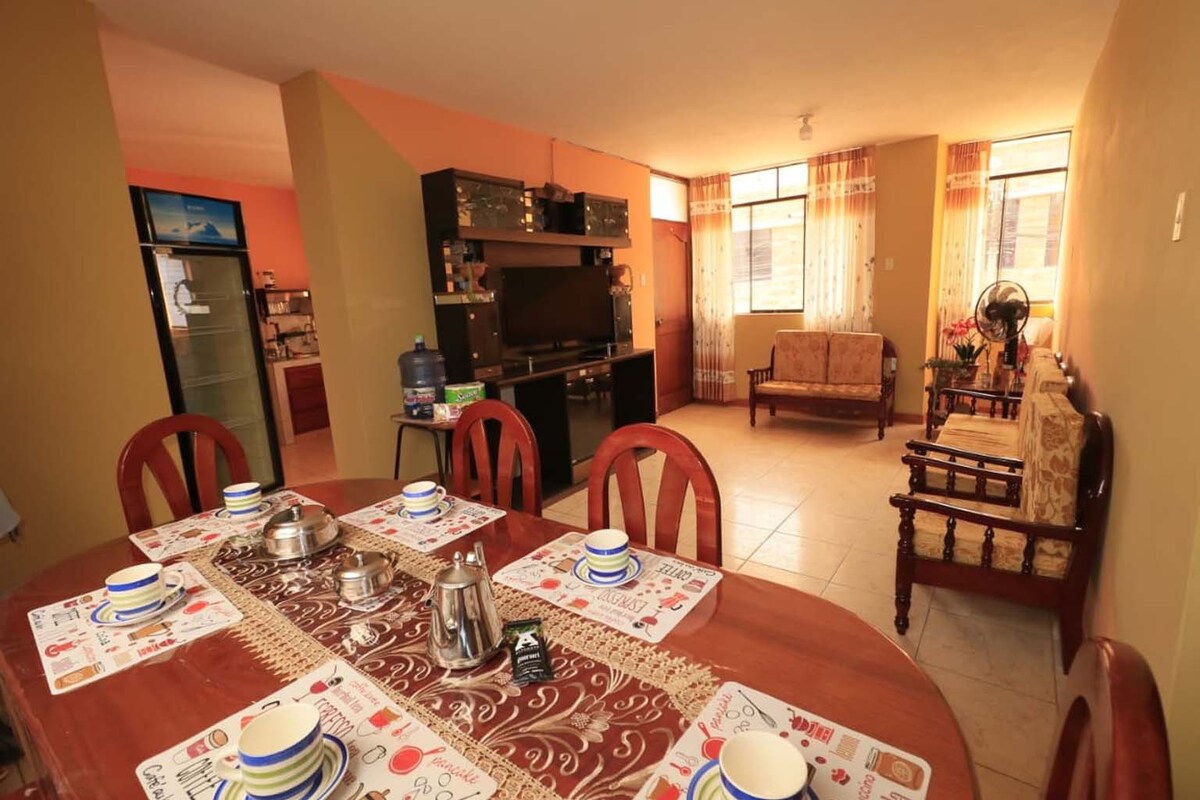 享受這間安靜的中心住宿,距離莫羅班巴廣場( Plaza de Armas de Moyobamba ) 5個街區,距離市場2個街區。 1間臥室,配有1.8米寬雙人牀( 2個方塊)和獨立浴室 1間房間,有2張半平方牀,共用浴室 1間臥室,配有1張半平方牀和共用浴室 三樓有客廳和屋頂等公共空間。
