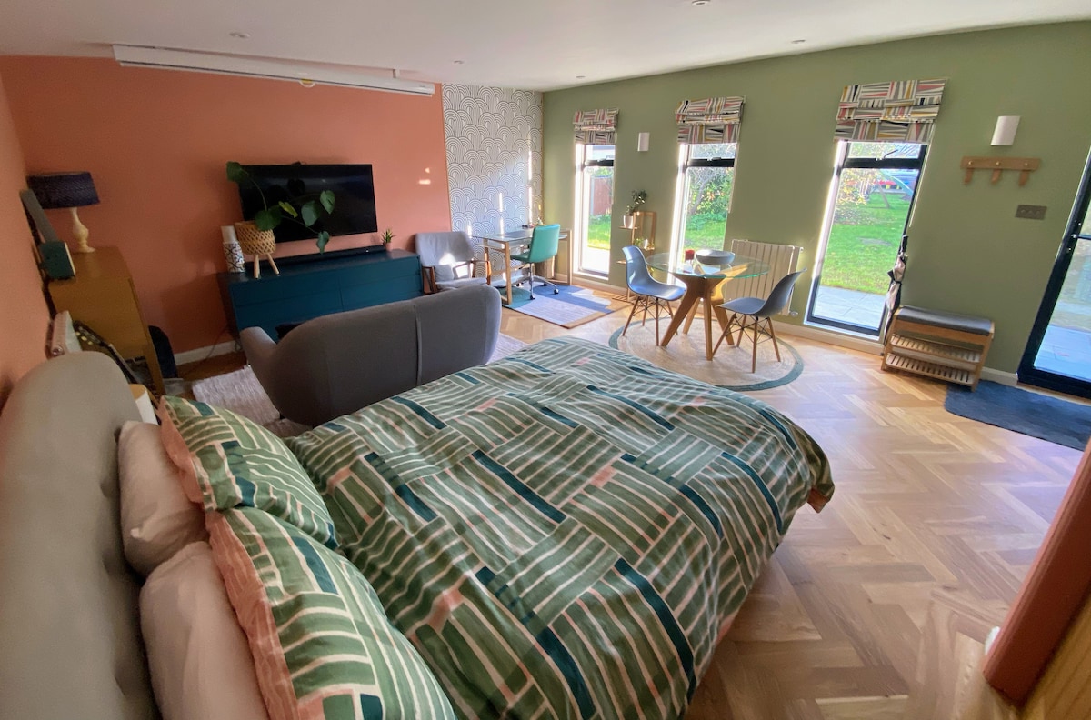 歡迎房客來到我們獨特的獨立建築設計的單間公寓 一間雙人臥室,配有套房 配備廚房的大型休息室 客廳裡的沙發可以變成一張單人床 (請注意:使用沙發床需支付額外的床單費用-一晚15英鎊-兩晚或以上30英鎊。) 全開式雙折門 提供嬰兒床(請攜帶嬰兒睡袋或其他合適的東西) 電動車充電(20-25 英鎊)可供充滿電