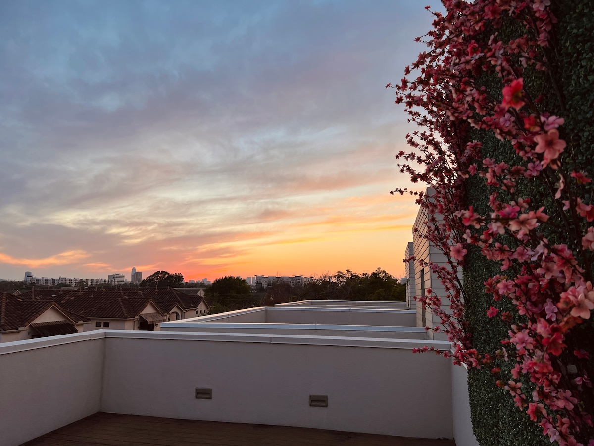 Tranquil top floor studio with skyline views in a prime central location. Bright, quiet, and intentionally designed for rest and ease. Wake up to sunrise from the king bed and unwind in a calm, elevated space above the city. With over 300 stays, guests consistently mention the comfort, cleanliness, and how relaxed they feel here. Thoughtful hosting and a smooth, reliable stay. Secure parking included, with easy access to Downtown and the Heights.