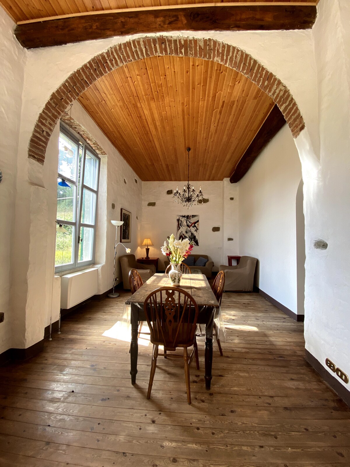 100平方米 一樓:入口配有廚房角落和帶淋浴間的浴室,客廳配有用餐區域和沙發牀,雙人臥室配有淋浴間的套房浴室,雙人臥室。 這間公寓裝飾有迷人的壁畫,可追溯到17世紀,可欣賞花園和周圍景觀的美景。 此單位不提供WiFi網絡