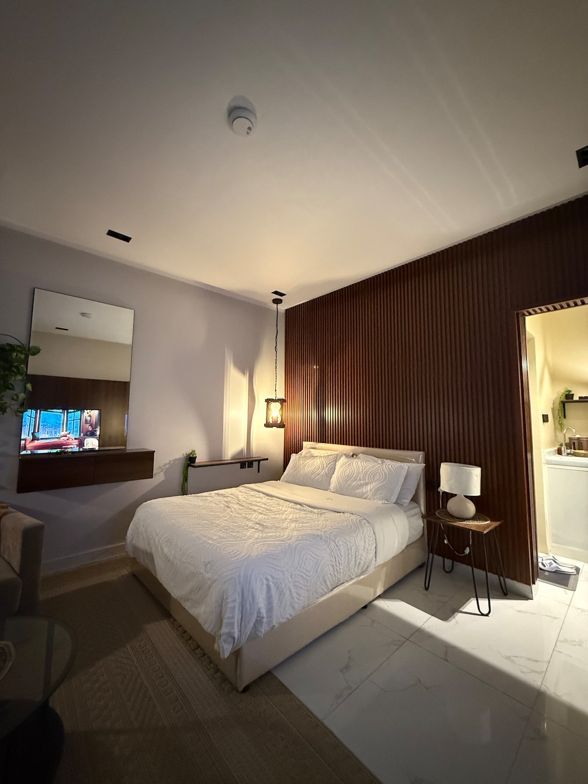 這是一間現代化的公寓,專為非凡的住宿體驗而設計,位於利雅德最好的街區之一,可欣賞KAFD的壯麗景色。它設有戶外休息區,配有螢幕和投影機,讓您享受愉快的夜晚。為了讓您舒適,床鋪包括一層高品質的14公分額外床墊。 「我們還提供特殊場合的活動協調服務(包括蛋糕和配件),需支付額外費用並提前預訂,確保您有一個難忘的體驗」
