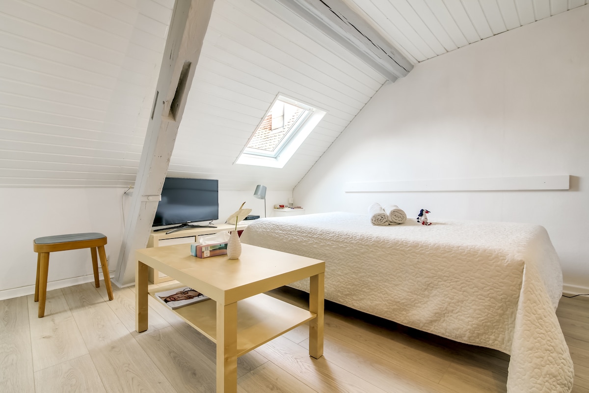 迷人的閣樓單間公寓, 2022年翻新;步行3分鐘即可抵達火車站,步行10分鐘即可抵達市中心。 單間公寓位於一棟典型的1930年代建築的三樓,包括設備齊全的廚房區域(爐臺、帶烤箱功能的微波爐、冰箱、咖啡機)、配有雙人牀的睡眠區域、電視和儲物空間;配有淋浴間、馬桶、洗手臺和洗衣機的浴室。