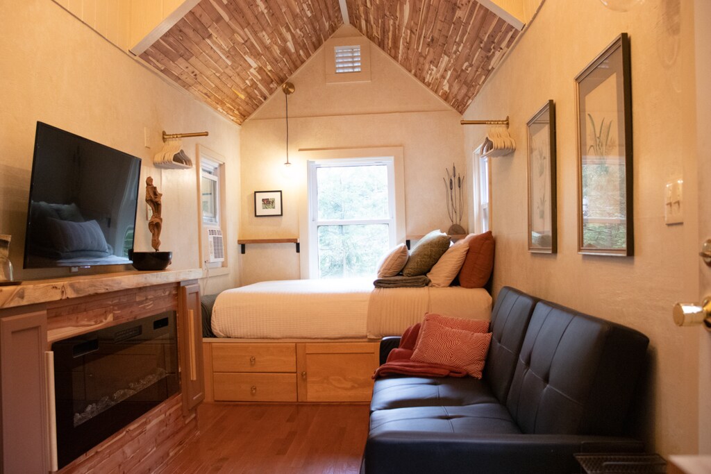 Charming + cozy tiny house, centrally located in the hills of middle Vermont. Rain or shine, enjoy the beautiful covered patio, relax in the cedar barrel sauna, roast marshmallows over a wood burning fire, explore all that Vermont has to offer or rest easy with our various spa amenities.