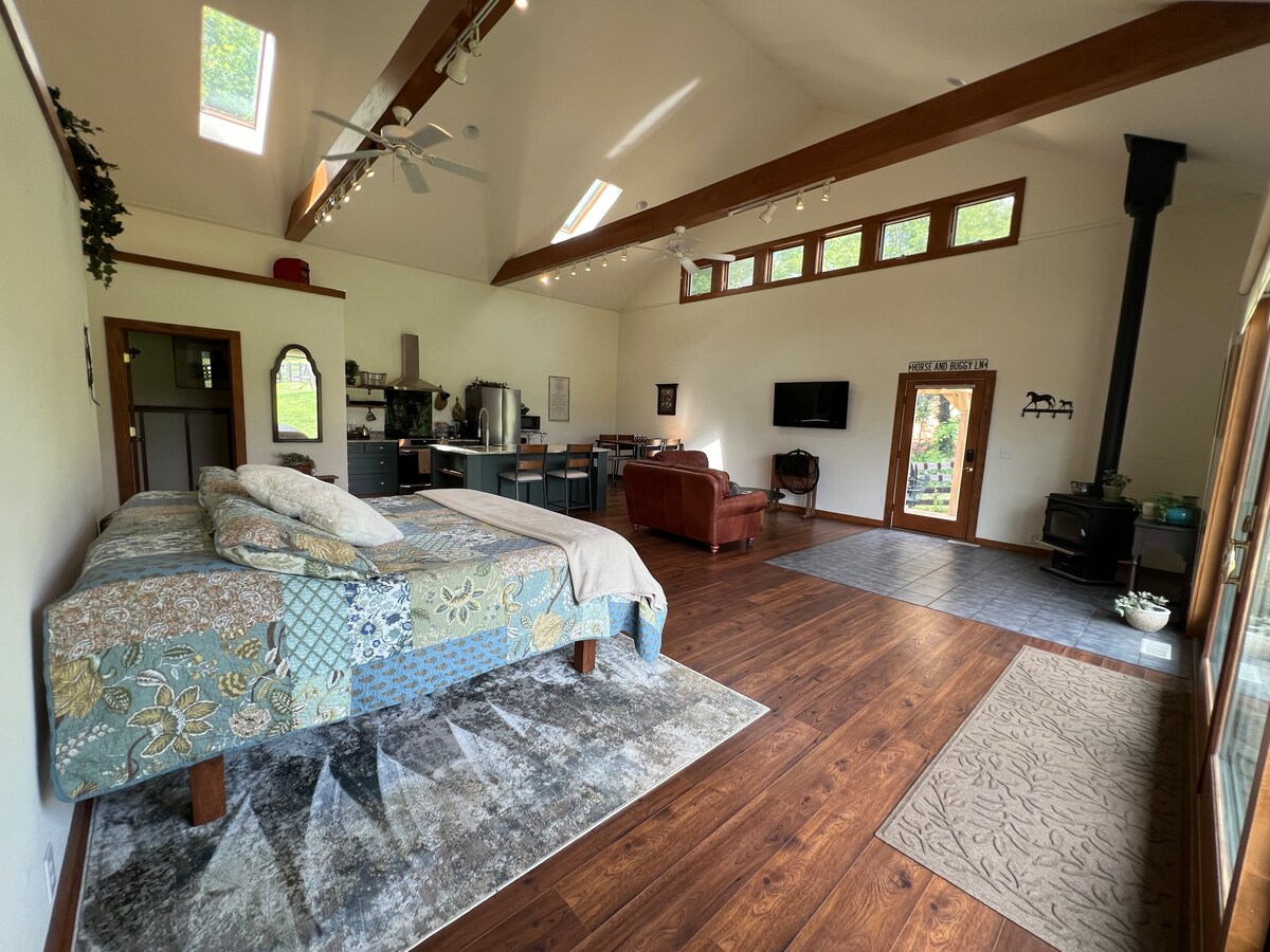 從列克星敦(Lexington)到山區的風景優美的鄉村車道,找到一個現代拱頂天花板的單間公寓,從您的生活空間欣賞到迷人的景色!900平方英尺的獨立入口單間公寓和露臺,位於一個有近50英畝私人土地的馬場馬場,四周環繞著國家森林。這間現代歐式設計的單間公寓以前是一間藝術工作室,距離列克星敦主街僅11.5英里。還有一個開放的高山丘,是完美的野餐地點,可欣賞360度山景!