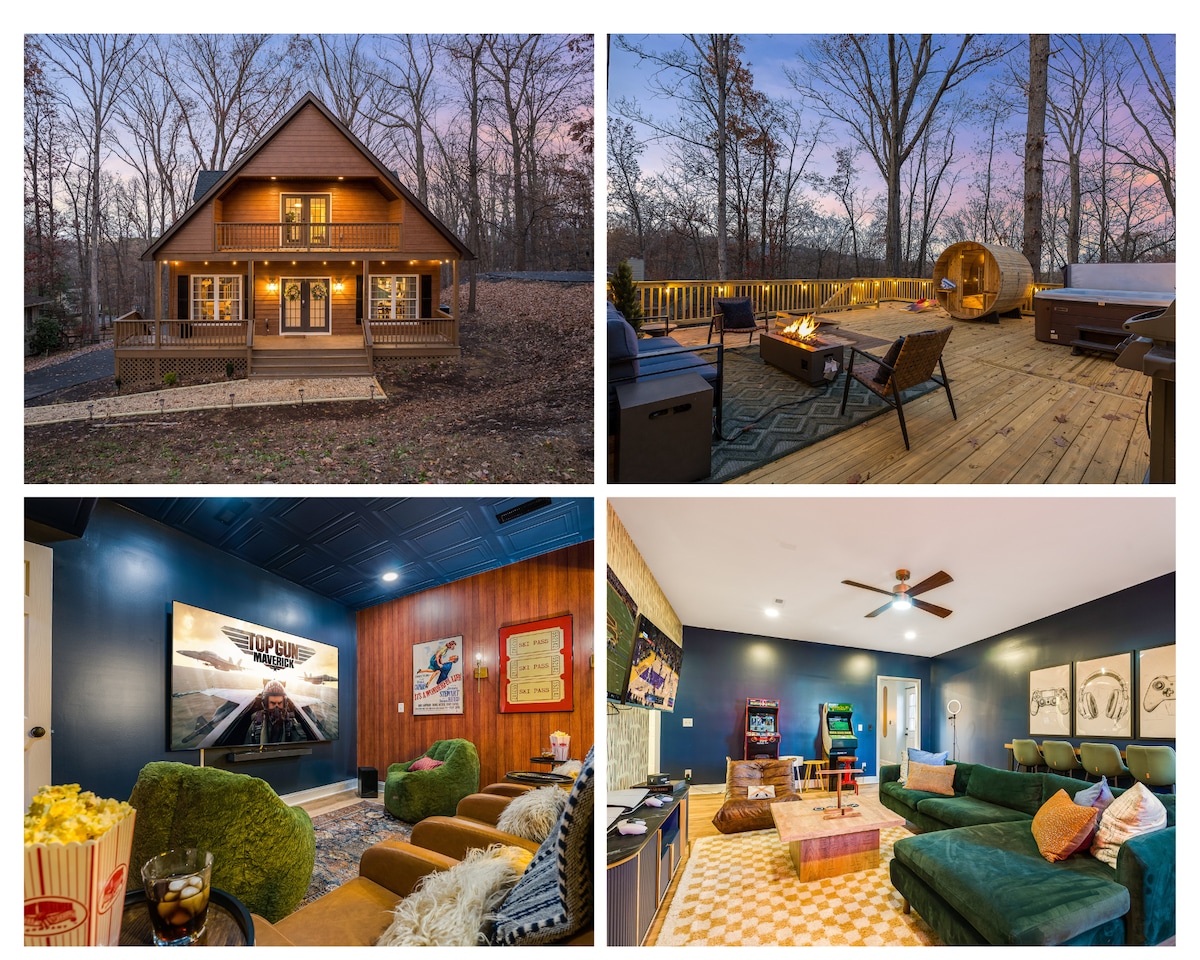🔥巨大的遊戲室;乒乓球、Ms. Pac Man、Simpsons、Pop-A-Shot籃球、飛鏢板和健身腳踏車 🔥4 間臥室,包括雙加大主臥室,配有套房(主樓層 1 間,下層 1 間) 私人露台上的🔥按摩浴池和桑拿房 🔥2間家庭房;Infinity遊戲桌(適合所有年齡的電子棋盤遊戲!)、65吋智慧電視、棋盤遊戲、壁爐 設備🔥齊全的廚房 🔥雙層床房,配有兒童玩具 🔥高速 WiFi 住宿超過 4 天可享🔥折扣 距離水上公園🔥2 分鐘