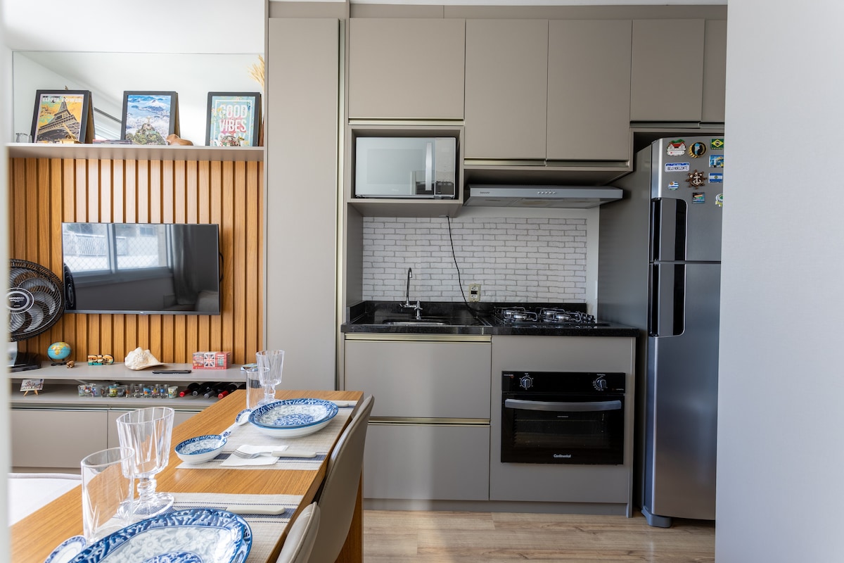 44平方米Nascente公寓,全面配備冷氣 房間1 :標準雙人牀/50英寸電視/鏡子 房間2 :單人牀+ bicama 2間帶衣櫃的房間/遮光Persiana/螢幕保護/全套Enxoval 浴室:吹風機 房間:沙發牀/Wifi 590 mgbt/電視55英寸/工作區域+椅子/桌子和餐椅 廚房:冰箱/淨水器/爐竈/烤箱/微波爐/Máq。 洗碗機/熔巖和乾衣服/空氣炸鍋/三明治/攪拌機/廚具/餐具/熨鬥/蒸汽 滅火器
