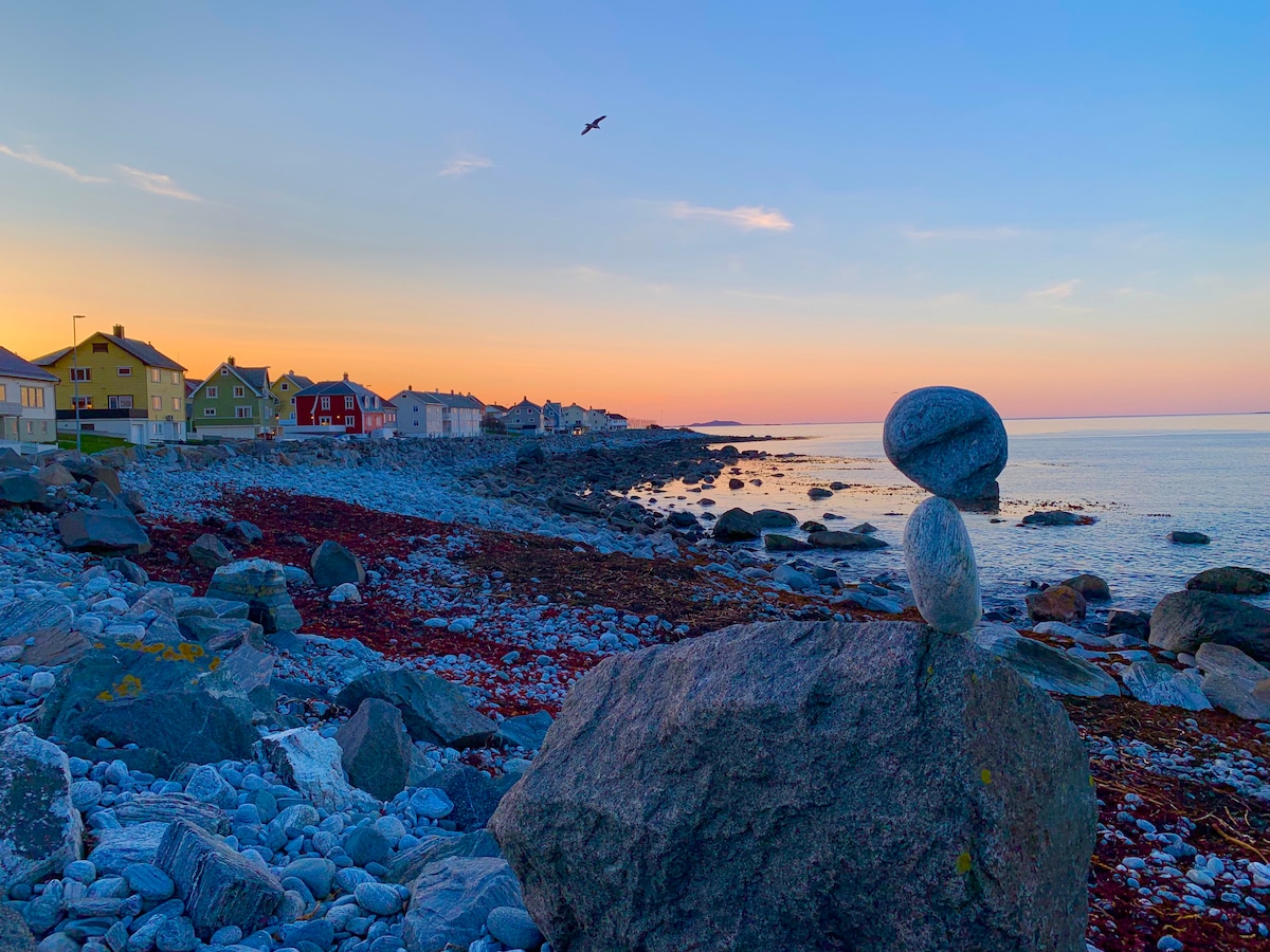 Hus i fremste rekke på unike Alnes med havutsikt,kort vei til badestrand,fiskemuligheter,surfestrand. Også gåavstand til Alnes Fye og kafé. Videre kan du ta på fjellsko og utforske turmulighetene på øya,særlig Storhornet ca.500 moh med utsikt til Sunnmørsalpane er verdt ett besøk. Videre er det kort vei til Sandvika som er ei flott strand brukt både til bading og surfing. Det er sauna 2.min gange frå huset og det samme med fiskemuligheter.