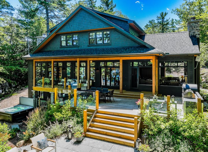 TERRA NOVA -抵達令人驚嘆的黑色小屋和匹配的Bunkie ! Muskoka花崗巖石小徑引導您前往前門,前門有木架柱和橫樑。 小屋左側的石頭小徑一直延伸到後院綠洲,多層甲板上有玻璃欄杆,戶外廚房配有柴火披薩烤箱、燒烤、迷你冰箱和8人餐桌! 四張坐墊椅可俯瞰海濱。 六個樓梯帶您下到一個花崗巖石露臺,咖啡桌周圍有4張椅子和一張沙發。 Traeger吸煙者讓您有機會從傳統的燒烤中享用晚餐! 幾個石板臺階帶您下到熱水浴缸,然後繼續步行到水濱。