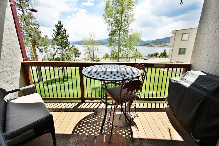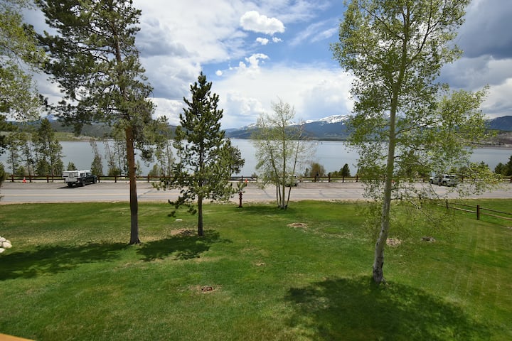 從這間狄龍鬆( Dillon Pines ) 1間臥室、2間浴室的連棟房屋步行前往湖邊。 二樓起居區充滿拱形天花板的光線和面向南方的大窗戶。 令人難以置信的山景和湖景。 步行即可抵達狄倫湖( Lake Dillon )和休閒小徑,全年前往湖濱和高聳的山景。 客廳配有燃氣壁爐、大型平板和沙發牀。 免費WiFi和有線電視。 設備齊全的廚房配有大櫃檯,可輕鬆準備餐點。 廚房酒吧或高大的露臺桌子可容納2-4人,配有酒吧凳,兩者都可以使用。 有蓋的私人露臺全年都可以使用,並配有雙人沙發和高桌。 一樓的露臺有長凳,可直接通往草坪和湖濱。 2輛車的免費地面停車位。 主浴室有洗衣機和烘幹機。