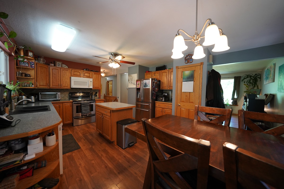 獨立房屋全都供您使用。這間小木屋擁有所有家居設備、設備齊全的小廚房、帶座位的大島和前面的露臺座位區。我們位於Selkirk Loop步道、Oxbow游泳洞旁邊,距離區域機場和Selkirk學院2分鐘車程。這個安靜的區域周圍有楊樹,靠近河流,有整個區域可供探索,所有這些都在小木屋的幾步之內。