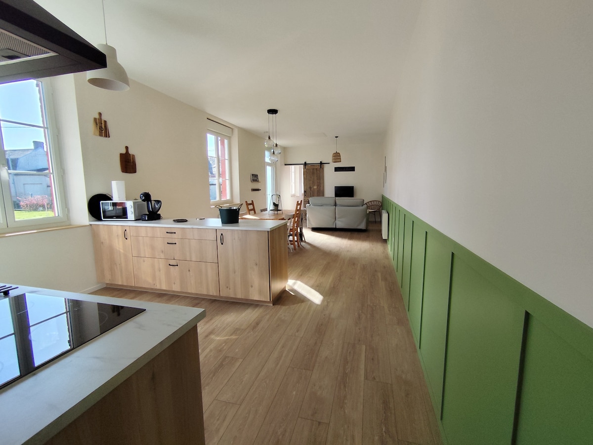 小屋(107 平方公尺)距離市區步行 10 分鐘。有圍欄花園、後院露台。一樓:設備齊全的廚房(冰箱/冷凍櫃、過濾式咖啡機和Dolce Gusto等)。客廳。可俯瞰花園的餐廳。1間臥室,2張床(90x200),淋浴間,廁所。私人洗衣機。樓上: 2 間臥室,每間臥室有 2 張 90x200 的床,另一間臥室有 1 張 160x200 的床,以及相鄰的浴室和廁所。床鋪已經整理好。包括暖氣和電力。桌上足球、車庫。允許攜帶2隻寵物