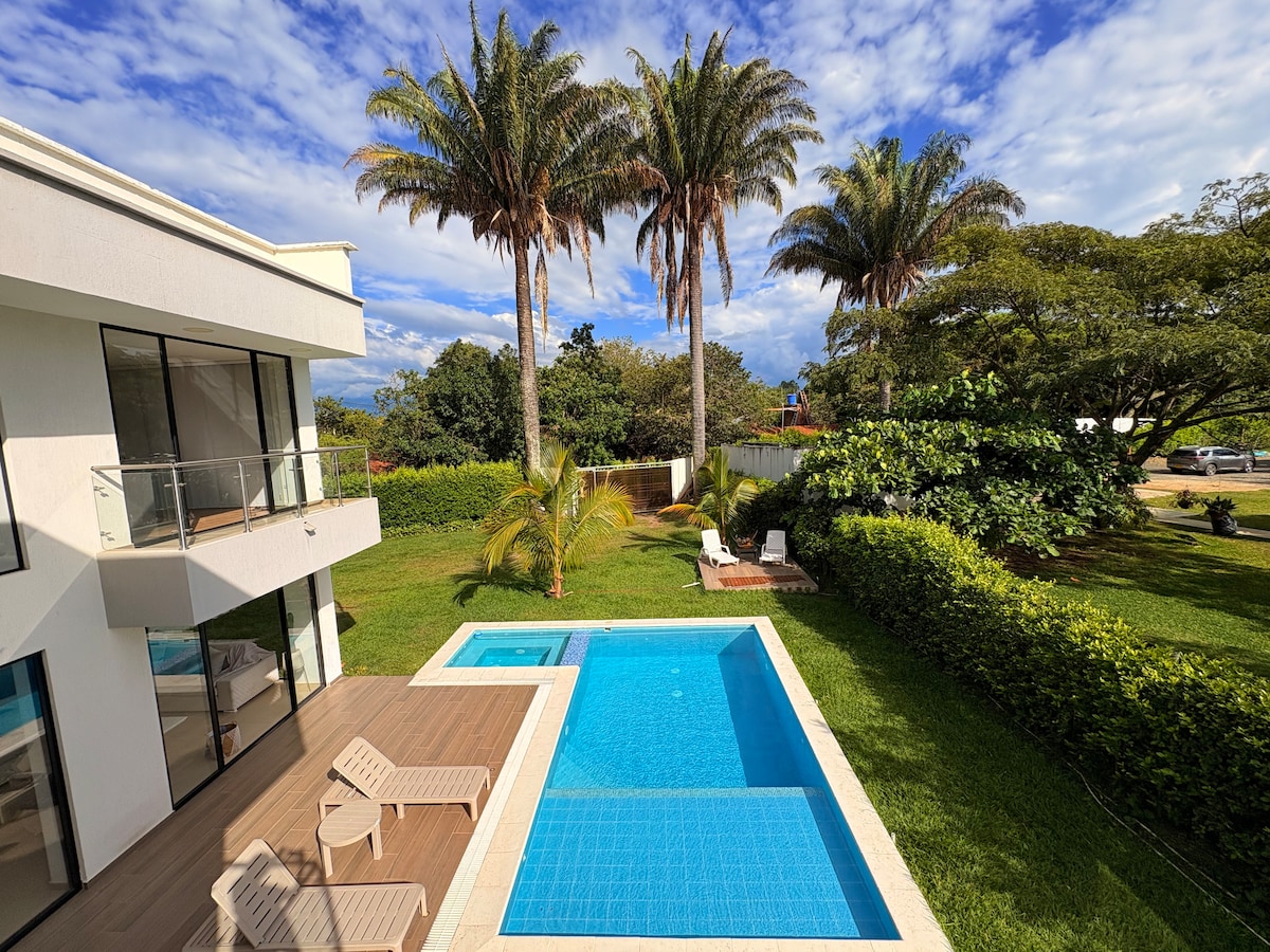 Escápate a esta casa campestre cerca de Cali, perfecta para disfrutar de la naturaleza y relajarte. Con piscina, jacuzzi, zona de juegos (mesa de billar, dinamo y ping-pong), amplios jardines y zona BBQ, es ideal para familias y grupos.