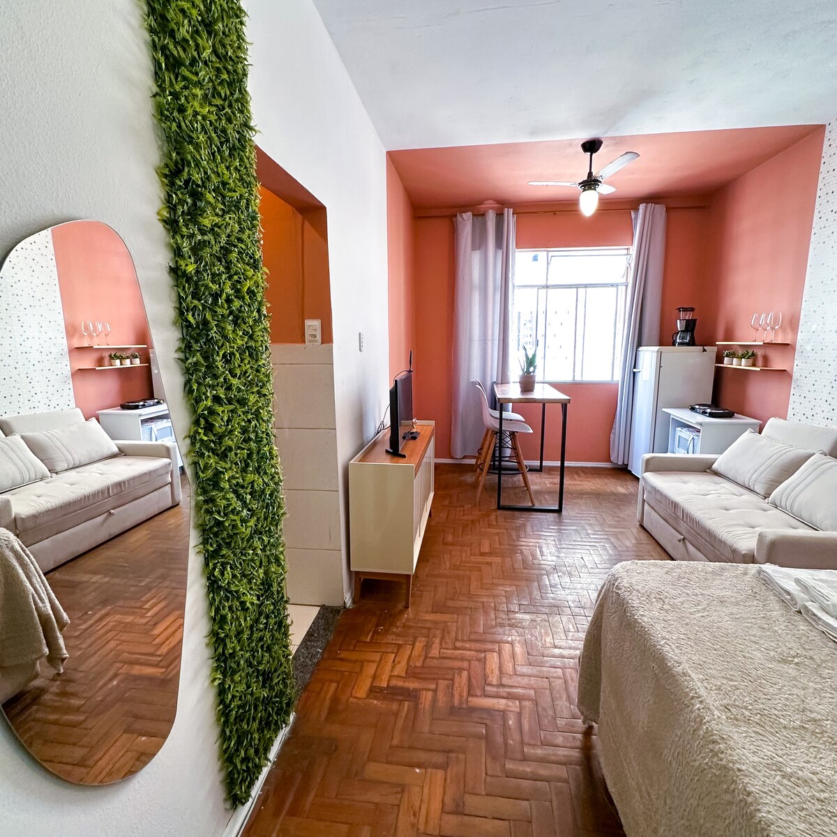 寬敞的獨立房間,出入方便,安靜有序。 我們是一個完整、舒適的空間,一切都井然有序,讓每個人都感到賓至如歸。 最多可容納4人的大房間,配有整合式廚房、陽臺、浴室、空調、迷你吧、衣櫃和電視。 住宅和安靜的街區,距離大道兩個街區。 Silva Lobo是Belo Horizonte的主要大道之一,擁有各種商業、藥店、超市、麵包店、商店和酒吧。
