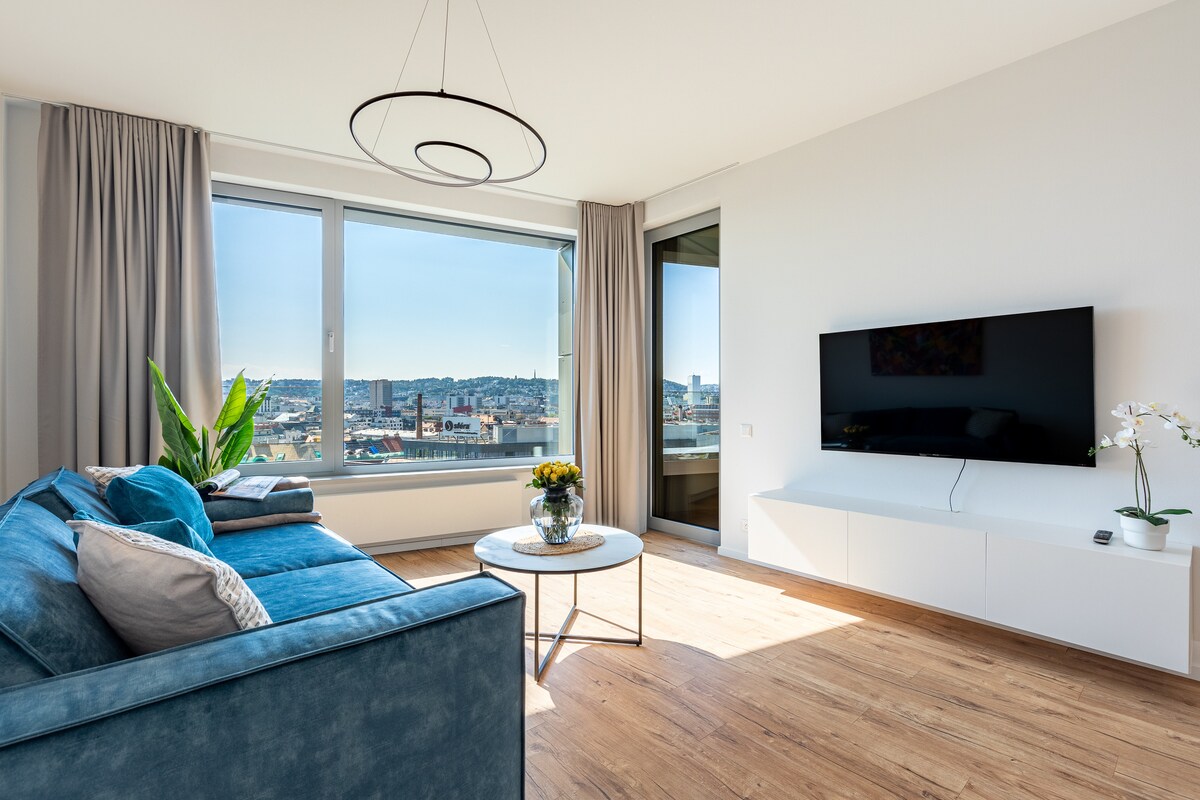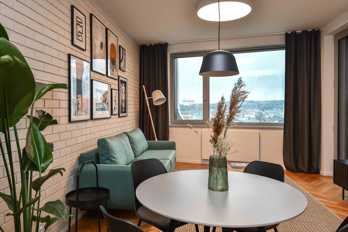 這位設計師位於Zaha Hadid的天空公園住宅13樓,可欣賞布拉迪斯拉瓦市中心的全景,讓您愛上這座城市。您可以在公寓的露臺上享用早晨的咖啡,或在120公尺高的觀景台欣賞美景。 毗鄰多瑙河遊步道、兩個購物中心,步行10分鐘即可抵達歷史中心,是市中心探險家的完美起點。