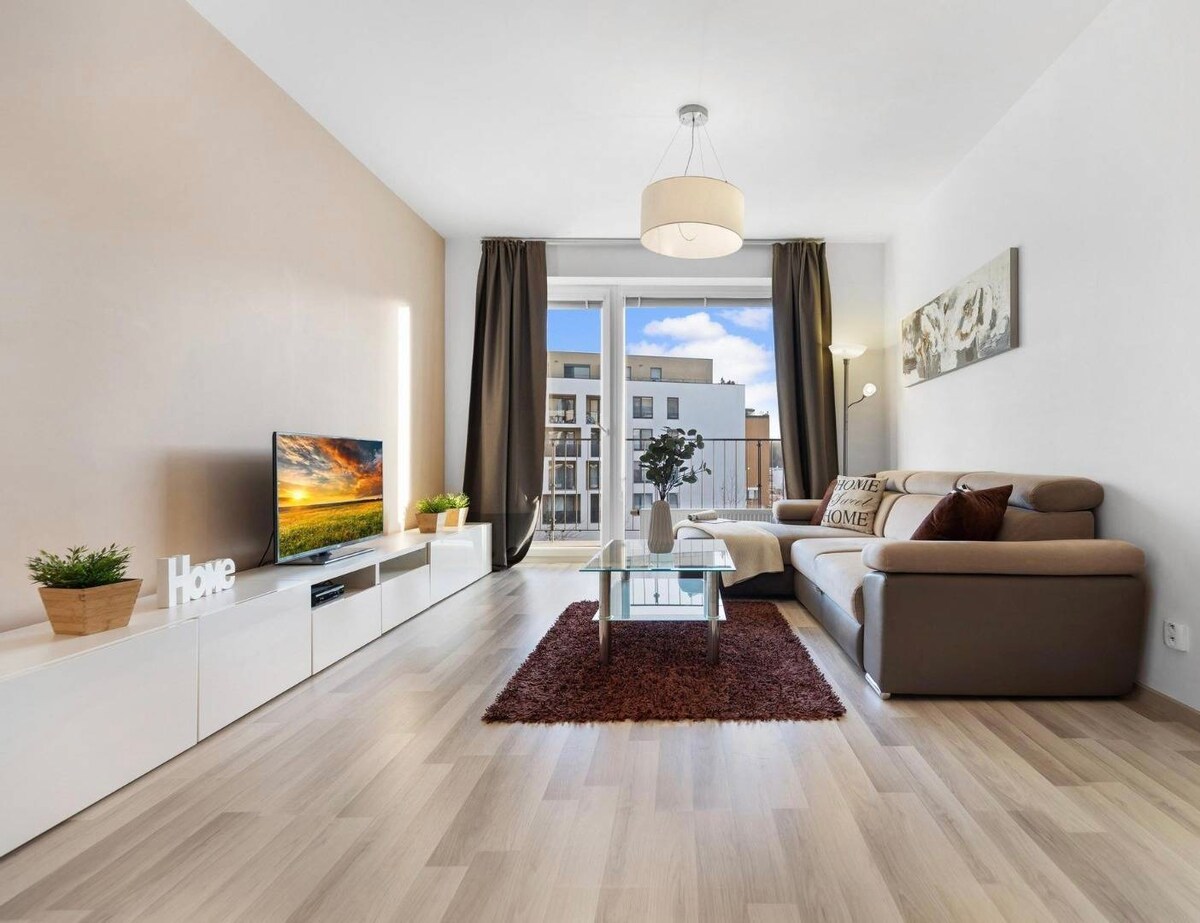 公寓位於4樓的新住宅中,地理位置優越,並以高標準布置。 公寓下方有一家美食店Billa、一家藥店DM、2家咖啡店、一家餐廳和一家煙草報刊亭。附近有2家很棒的啤酒和葡萄酒吧。 您可以從火車( 5分鐘)和巴士站( 7分鐘)或機場( 20分鐘)輕鬆抵達公寓,只需乘坐1次交通工具(巴士或電車)。 前往市中心,步行15分鐘或乘坐電車( 5-7分鐘)