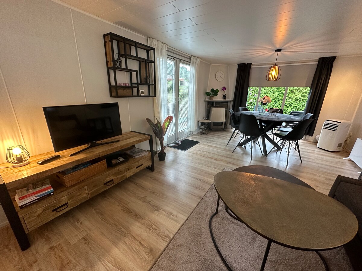 Nijmegen附近時尚的獨立度假屋,裝潢非常舒適,配有陽光/遮陽的大花園、各種露臺、遊樂場設備、休息室套裝、餐桌、燒烤、戶外爐竈。3間臥室,可供6人入住。 主臥室有嬰兒角。2張嬰兒牀、更衣桌、高腳椅、內外玩具。 簡而言之,這是與全家人、家人和/或朋友一起放鬆度假的好地方! 位於一個小型家庭公園,其中包括一個遊樂湖和游泳設施。