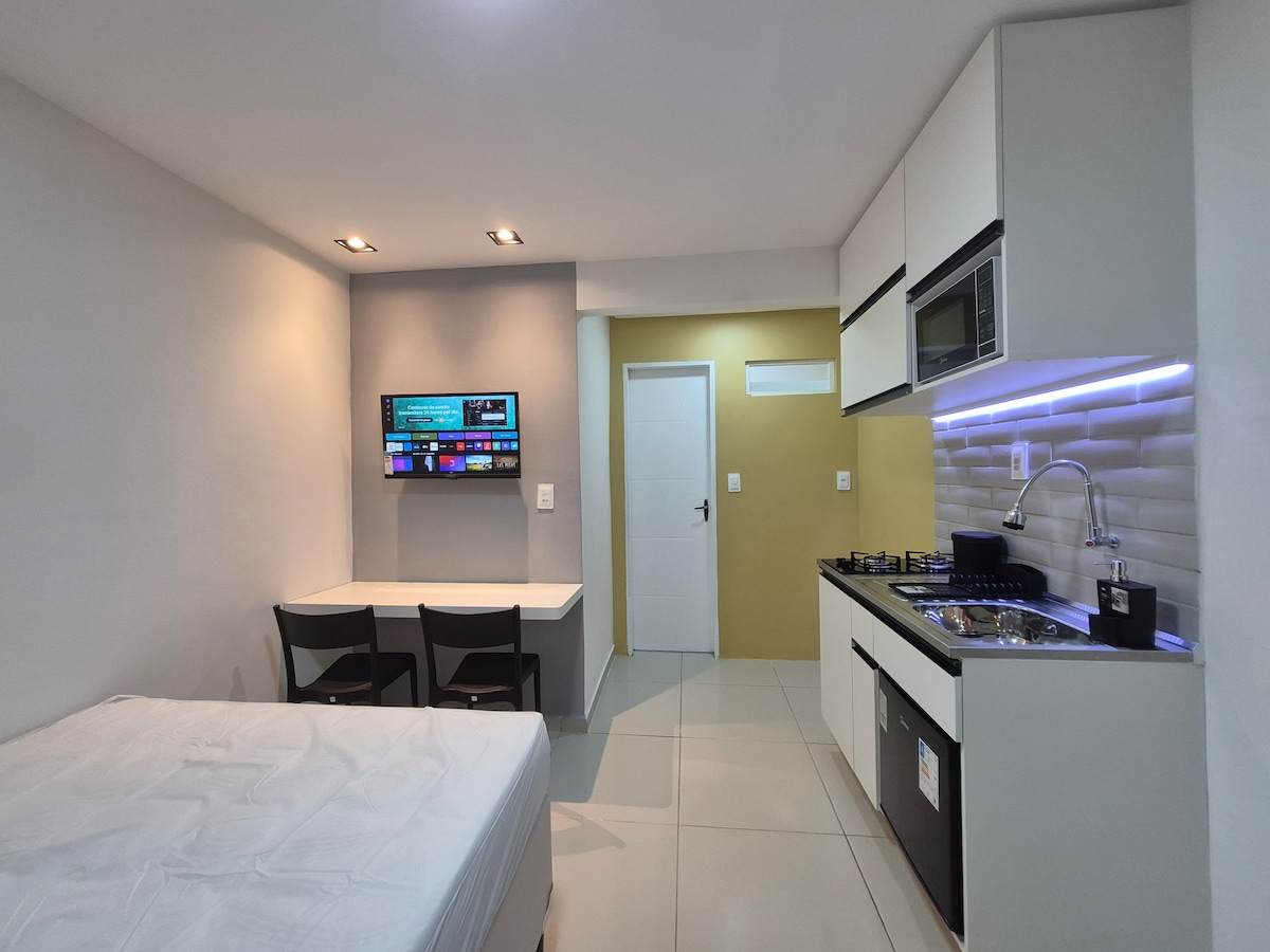 位於若昂佩索阿(João Pessoa)海灘的地中海風格單間公寓。 這間小巧舒適的海景單間公寓採用白色和藍色裝飾,並融入質樸的細節,將希臘的魅力帶到帕拉伊巴州的海岸,是情侶或獨遊旅客的理想之選。 迷人的度假勝地,非常適合放鬆身心,而不會放棄舒適和完美的位置,靠近很棒的餐廳和旅遊。 設備齊全,還有配備泳池、健身中心、洗衣房和停車場的休閒區。