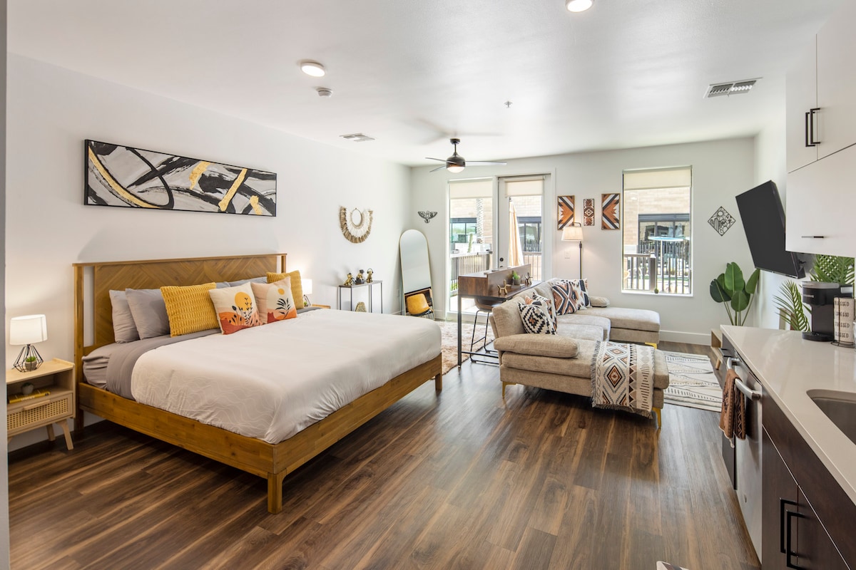 Maple Ash的工作室是您的私人度假勝地,位於標誌性的Maple Ash社區,是Tempe最歷史悠久和最適合步行的地區之一。 非常適合春季訓練的粉絲、ASU 訪客、雪鳥和情侶。 在設有營火、休息室座位和室外用餐的全封閉庭院中放鬆身心。 步行前往ASU、Gammage、Mill Ave、Tempe Beach Park的節日,並在附近的Cactus League球場觀看比賽。 距離天港僅10分鐘路程。