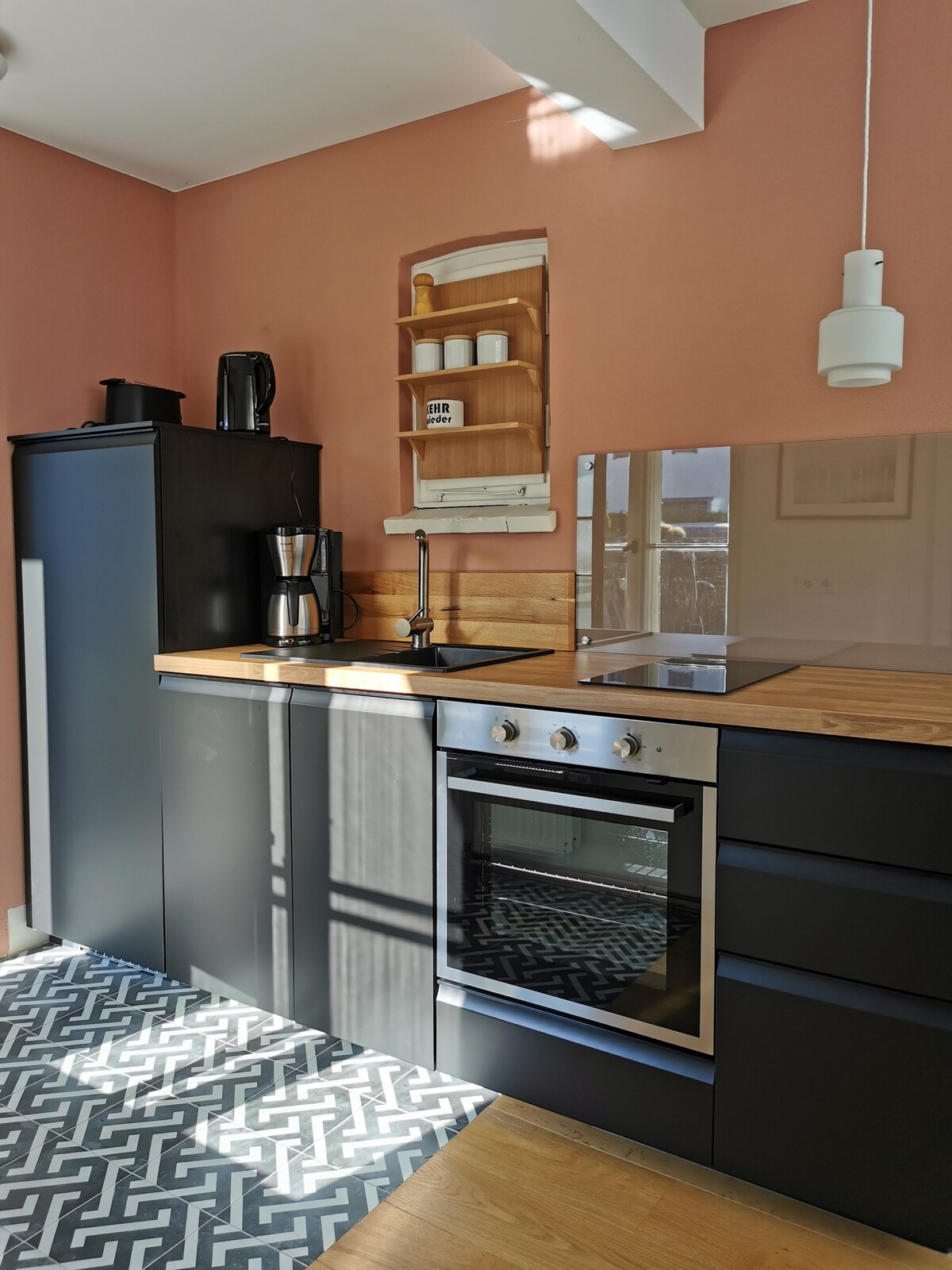 該度假公寓位於非常安靜的位置,在欣斯特的廣闊海灣景觀上,有廣闊的步行和自行車道。步行10-15分鐘即可抵達海灘。步行幾分鐘即可抵達港口和鶴觀景台。朝南的陽台提供了放鬆和曬太陽的空間。購物設施(折扣店、麵包店)步行即可輕鬆抵達。有汽車和自行車的停車位。