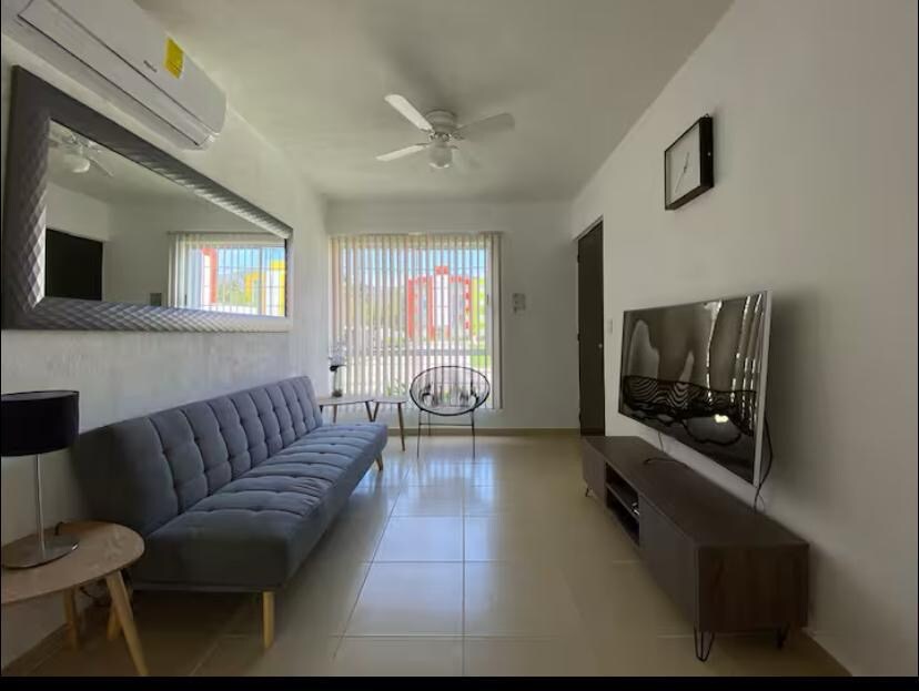 Departamento en planta baja con Aire Acondicionado, estacionamiento propio frente a la ventana y vigilancia las 24 hrs., condominio con barda, agua caliente, Wi-Fi, t.v. smart ROKU, cocina integral, utensilios de cocina, sartenes, platos, cubiertos, refri, horno de microondas, cafetera, licuadora, plancha. El portón de la entrada es a control remoto para los vehiculos. Ubicado a 15 min de la playa de Puerto Marqués, 18 min al Revolcadero, cerca de plaza comercial el Patio.
