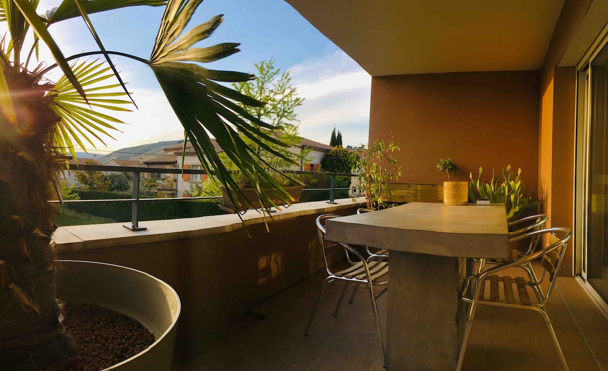 A7度假路線的理想停留點。 明亮的65平方米公寓,配有陽台。 高速光纖WiFi。 非常適合2對夫婦、家庭或專業人士。 距離里昂25分鐘,提供2間臥室,配有1張大床和1張標準雙人床、設備齊全的廚房、溫馨的客廳和一個適合行動不便人士的上鎖車庫。 高清平面電視、咖啡機+咖啡,讓您的住宿更加完美。 提供毛巾和牀單。