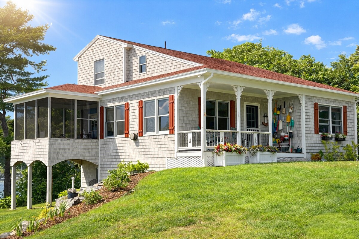 迷人的緬因州旅居,兩個露天平台俯瞰大海。 兩個有頂露台懸掛在水邊,樓下陽台的樓梯可直接通往水邊/海灘。 上層的露台設有美麗的休息區,可俯瞰海灣和沿岸野生動物的全景。 這裏的日出特別美麗,經常可以看到白頭海鷹、魚鷹和海豹。 真正的緬因州體驗!