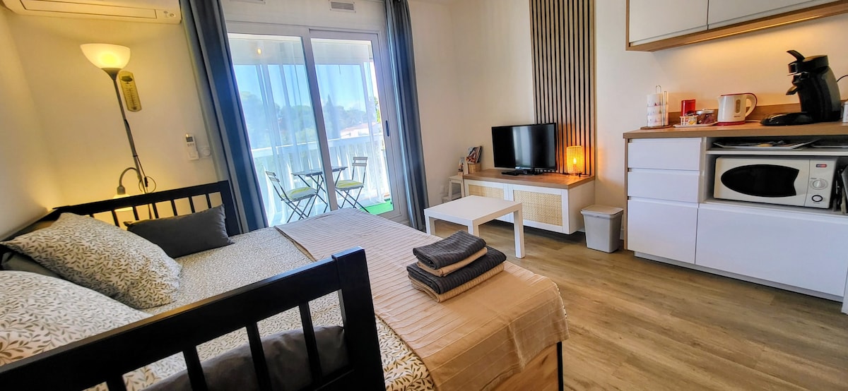 Profitez d'un logement climatisé, élégant - avec linge inclus, lit fait - et central (commerces, restaurants, mer ), au sein d'un jardin paysager et parking privé sécurisé ! - Suite-studio indépendante de 19 m², attenante à une villa. Vous profiterez d'une belle terrasse et salon extérieur. - Lit convertible Dunlopillo 160. - Espace snacking avec frigo, micro-ondes, vaisselle, barbecue (pas de cuisine ni plaques de cuisson ou four !) - En option : Lit BB, Hangar pour vélos, kite-surf...