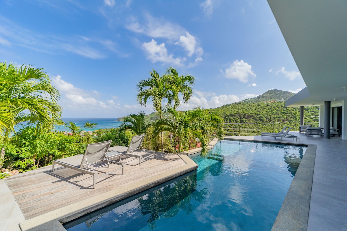 全新別墅,非常愉快和放鬆,可以看到Petit Cul de Sac灣的壯麗景色。 這個房源充滿魅力,擁有傳統的小型聖巴特(第三間臥室) ,非常適合家庭入住... 它由設備齊全的廚房、餐廳和俯瞰泳池和海景的小型戶外客廳組成。 空調起居區(電視) 2間臥室、更衣室和小辦公室、2間浴室。 您將感受賓至如歸的感受!