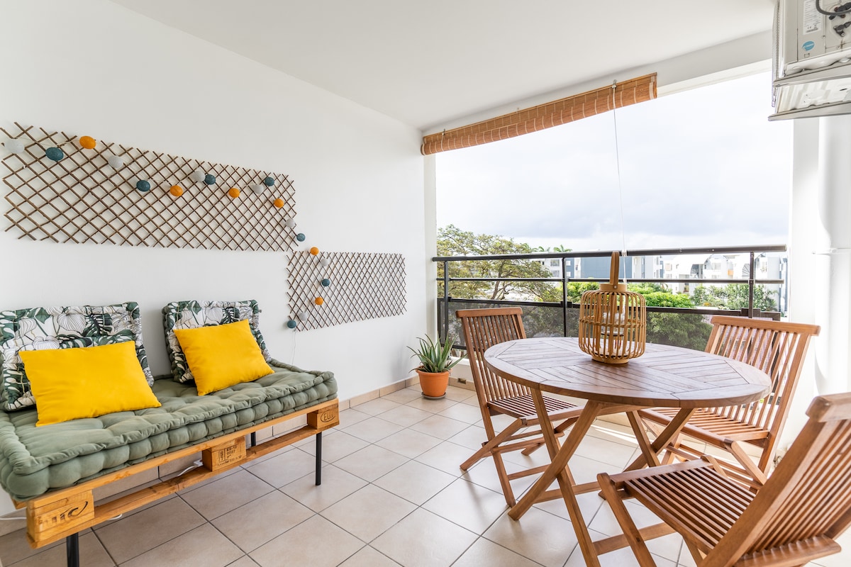 這間舒適的公寓( T2 40平方公尺+ 12平方公尺的戶外區域)位於俯瞰聖丹尼斯市,從機場開車15分鐘,步行3分鐘即可抵達纜車總站,是您探索島嶼的理想基地。 爬上幾個彎道即可抵達公寓,享受舒適的露臺和壯麗的全海景。 度假,就好像你真的在家裡,但在世界末端!