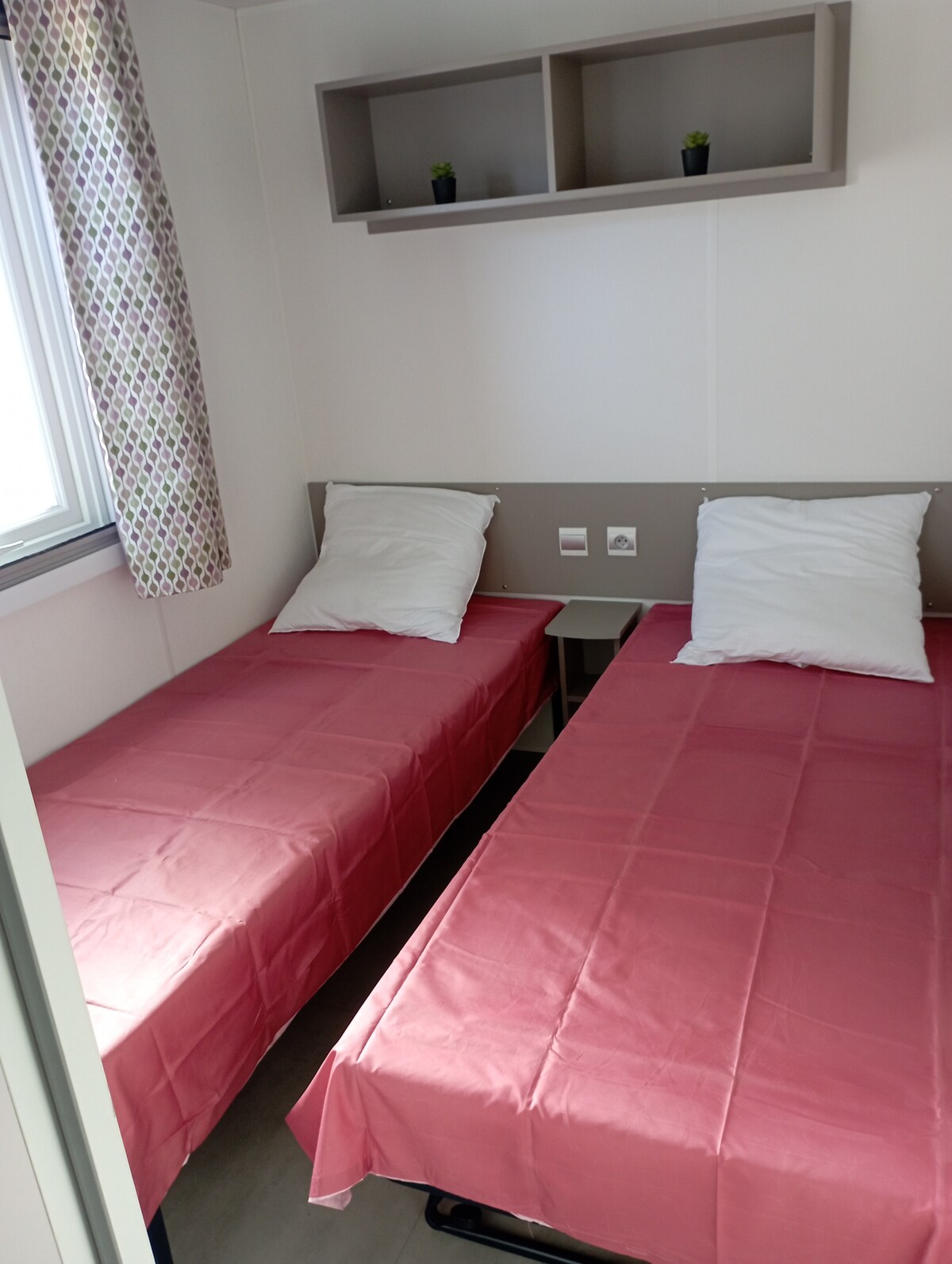 Mobil home au calme dans un cadre naturel et verdoyant entre mer et forêt. Un séjour de détente entre famille et/ou amis. Diverses activités sont proposées au sein du camping. Un minimum de deux nuits ( hors saison) et mini 4 nuits en saison et un maxi de trois semaines consécutives. À votre disposition un barbecue à gaz, télévision, un kit démarrage offert (éponge, papier toilette, chiffonnette et sac poubelle), grand frigo, cafetière, torchon et essuie main . Lits fait à votre arrivée