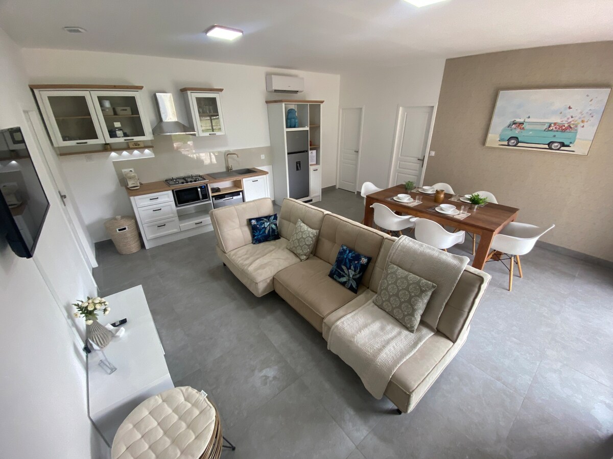 全新的漂亮小別墅,由官方旅遊住宿排名機構評為 4 星級。舒適度高,所有房間均配有可逆空調。 安靜的街區。步行3分鐘即可抵達CARABIOL景點,在樹林中有一個露天舞廳、兒童遊戲和自然散步區。 靠近(不到1小時)加爾橋、尼姆、竹林、洛澤爾、阿爾代什、Pont d 'arc、阿萊斯機械極等...