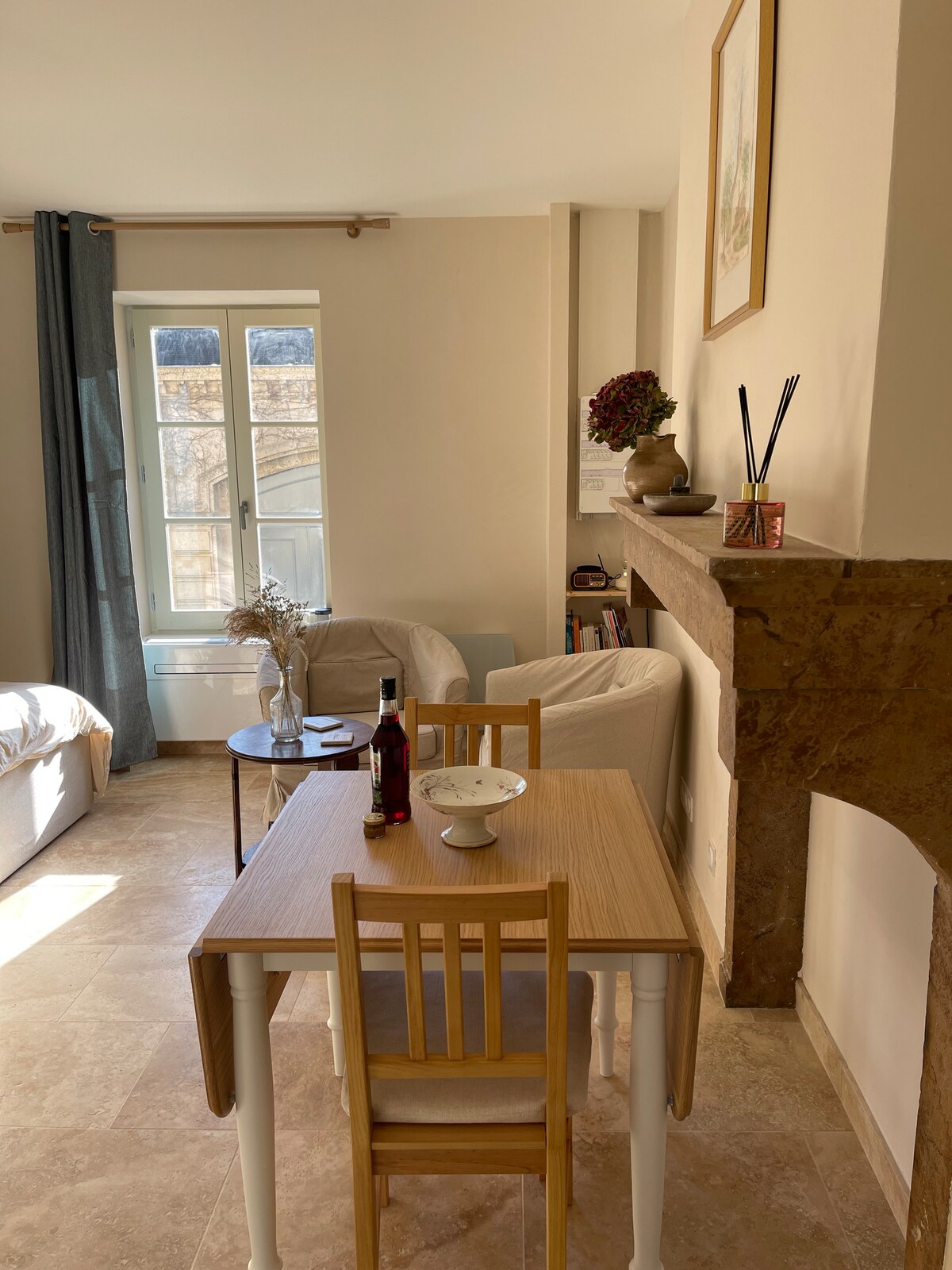 Welcome to our charming apartment, which we’re proud to say has a four-star award from the Departmental Tourist Board. It's in an historic buidling, inside the ramparts in the very heart of Beaune, but in a quiet side-street. It features a salon/dining room, an independent, fully-equipped kitchen, a bedroom and separate bathroom. Bright and sunny with high-beamed ceilings, a stone staircase and marble corridor, it also features a lovely glass 'verrière' overlooking an interior courtyard.
