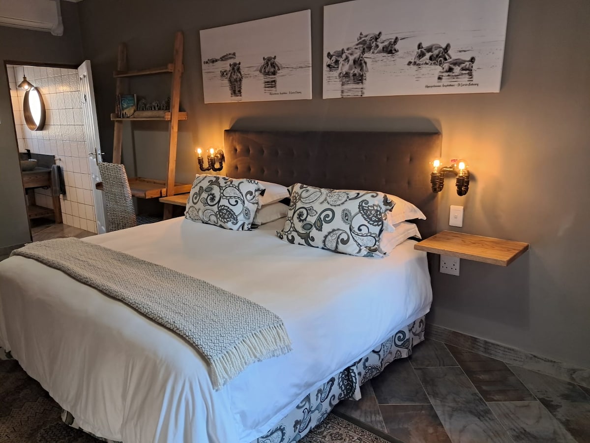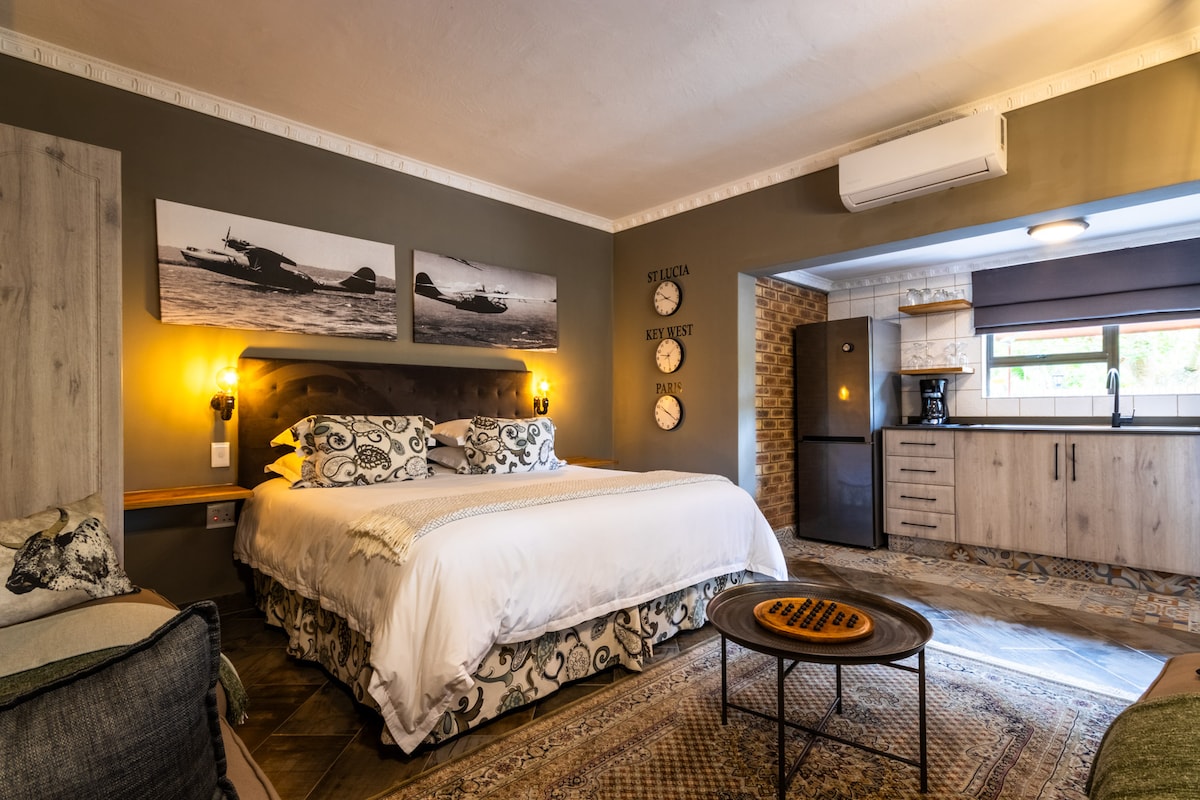 This apartment is an open plan apartment and is situated on the ground floor level of the lodge, sleeps up to 2 persons and is equipped with a Double bed. The apartment has an outside undercover patio/seating area with a view of the entrance to the Lodge. Hummingbird is decorated with several unique pieces of art by Elzabe Booysen (Something Elz Art).