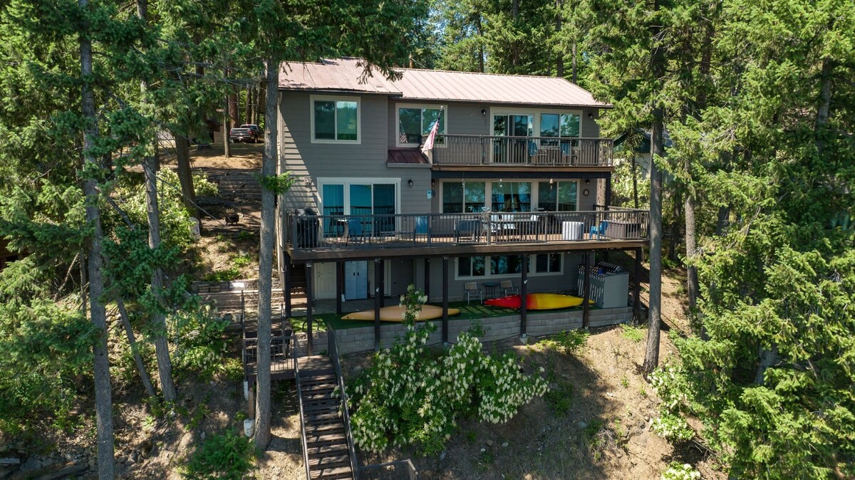 Summer paradise! Enjoy (rare) all-day sunshine at this A-frame cabin. Situated in an exclusive bay, this lakefront cabin has a large private dock and clean, deep water (no swamp/seaweed). This stylish mid-century cabin has a large flat lot surrounded by tall pine trees and local deer. The BIG panoramic lake view faces the sunset, for golden evenings on the deck or around the fire pit. Fully equipped for a short or long stay on exclusive Hayden Lake. Starlink WiFi. Ample parking.