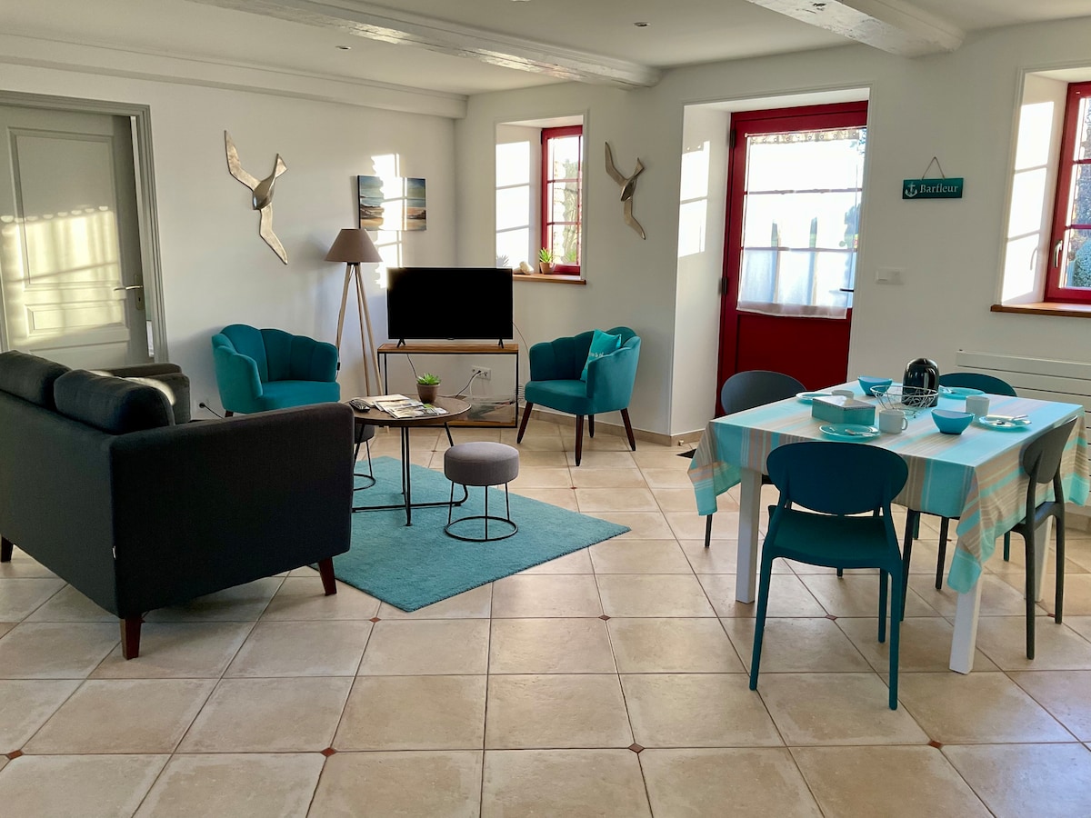 80平方公尺的房子全面翻修。靠近設施和歷史悠久的Sainte-Mère-Elise村莊,有露臺和大花園。 距離海灘5分鐘路程。 一樓:客廳、設備齊全的廚房和6/8人桌。 客廳配有沙發(可轉換) ,從中午俯瞰陽光明媚的露臺的凸窗,可通往花園。淋浴間。 樓上有2間臥室。 服務包括:提供牀上用品和沐浴牀單、整理牀鋪。