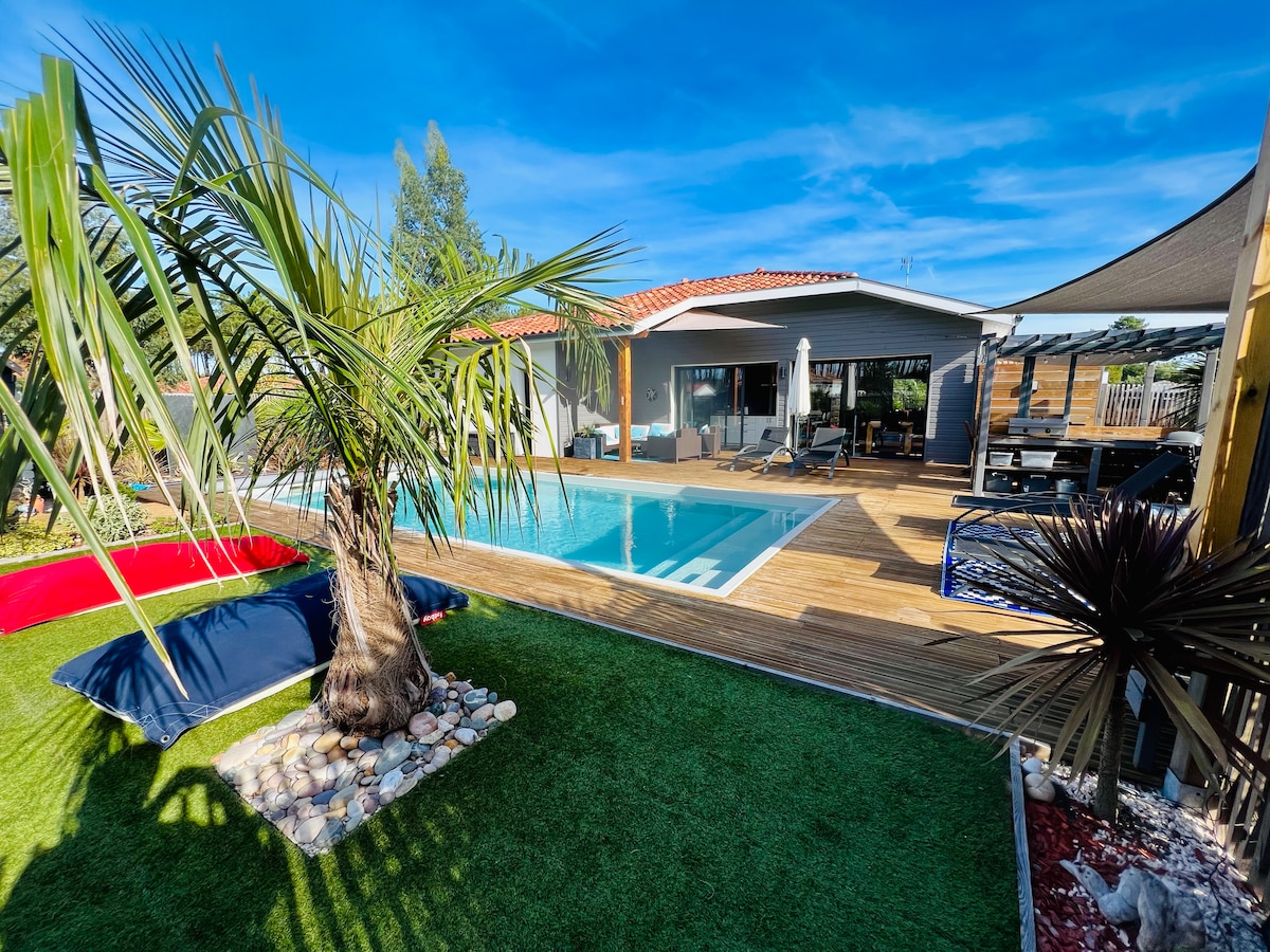Belle maison landaise rénovée, à la décoration cosy et chaleureuse, disposant de 4 chambres doubles équipées de télévisions, 2 salles de bain, cuisine séparée, wifi. Une terrasse à l'avant avec espace repas, barbecue/cheminée et jardin à l'arrière avec piscine 7x4m, espace repas, table de ping pong et bains de soleil à disposition. La propriété est située à 1.1kms de la plage du lac de Léon, à 9kms de l'océan et les commerces sont à proximité. Jardin clôturé, animaux acceptés.