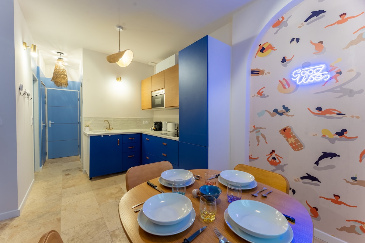 位於鳥鏡區域的全面翻修公寓。 您會發現一個客廳,配備了廚房和一張全新的140沙發床,配有高級床墊。 令人驚嘆的浴室,配有熔岩機區域和獨立的馬桶。 它位於市中心,步行即可抵達Ferrières海灘、市場和餐廳。 您距離藍色海岸只有15分鐘路程。 你有WiFi和Netflix。 不允許舉辦派對,我會立即收到通知