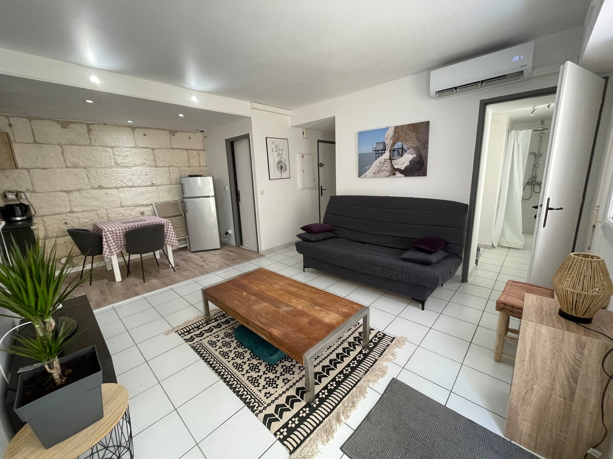 Studio cosy paisible et agréable, fraîchement rénové, mars 2023, profiter de son emplacement idéal. Situé à 5 min à pied de la plage, du coeur de la ville de royan avec son marché central, à 2 min à pied d'un commerce de proximité, 10 min à pied de la gare, moins de 10 min en voiture du centre commercial. Évadez vous en profitant des activités multiples; nautiques, zoo de la palmyre, balade, accrobranche, bowling, site historique, ... Logement équipé de la fibre et d'un rafraichisseur d'air.