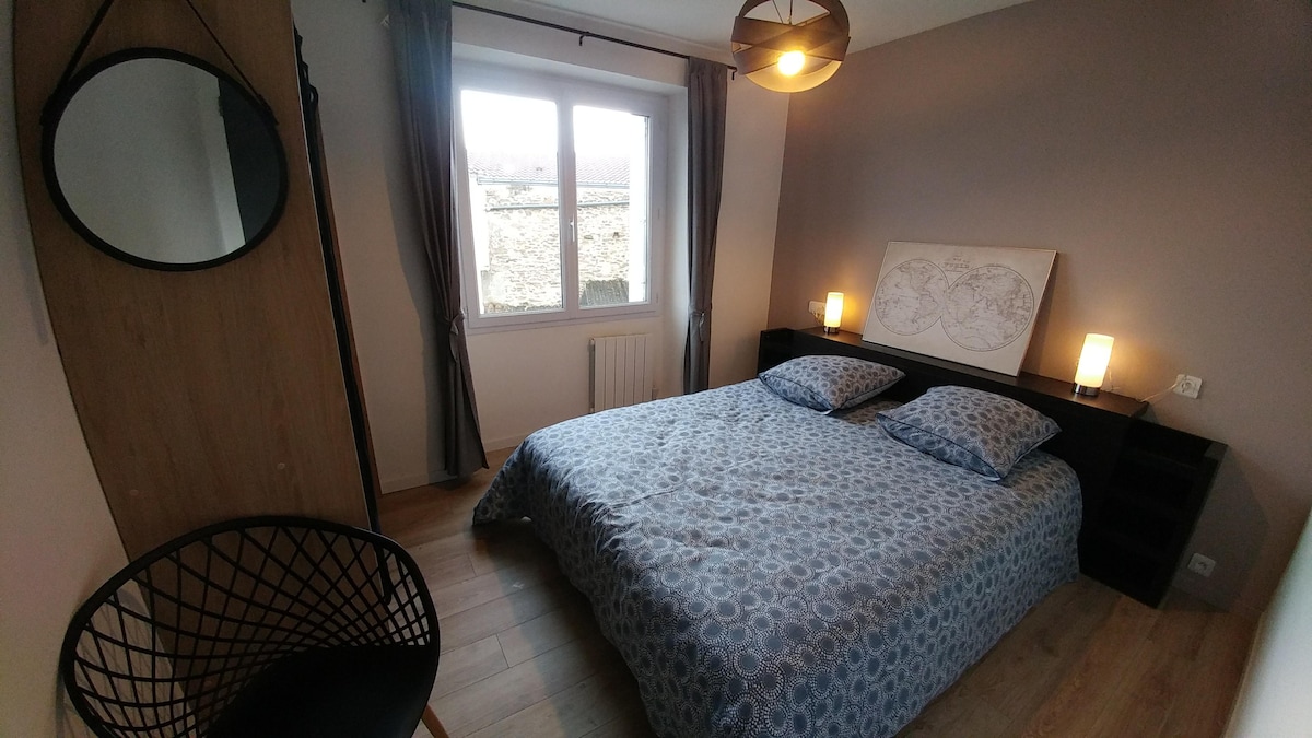 Grand studio 2 adultes maximum et 2 enfants, fraichement rénové en plein bocage Vendéen dans maison familiale de bourg. Studio avec entrée indépendante composé d'un salon avec clic-clac +TV + cuisine équipée + coin nuit avec lit double +Salle d'eau. Vous profiterez d'un espace arboré de 4000m2 avec parking privé. Chemins de randonnées, ferme, base de loisir et parcours accrobranche à proximité. 2 nuits minimum pour les mois de juillet et août.