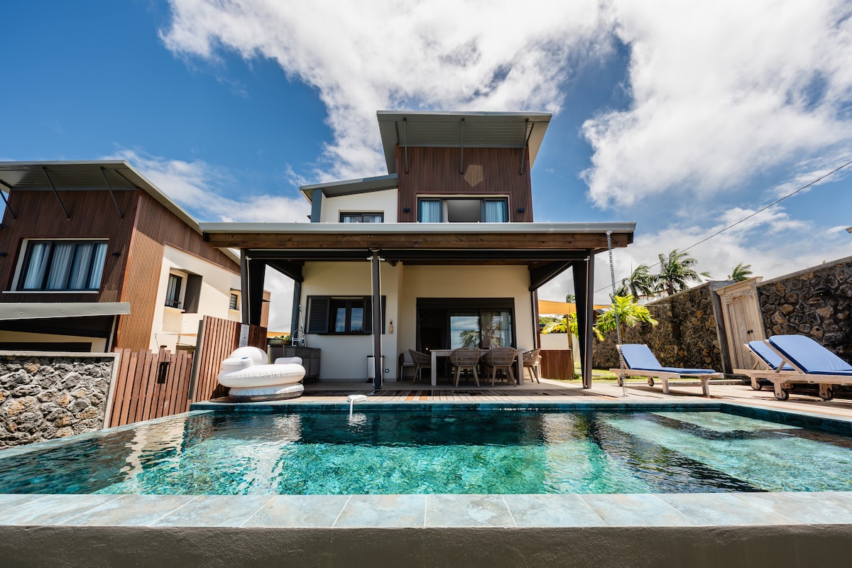 TB 別墅,面積 180 平方公尺,配備家具,裝潢風格為海洋風,非常適合 7 人入住。35 平方公尺的陽台,配有戶外休息室和餐桌 + 100 平方公尺的私人花園,配有泳池/燒烤設備,保證安靜和私密。可停放 2 輛車的私人停車位 + 可停放 1 輛車的封閉式車庫。大型大教堂客廳,設有餐廳、閱讀區和開放式客廳/電視,開放式廚房,設備齊全。2 間通風良好的臥室和 1 間空調臥室。放鬆舒適,期待與您相見!