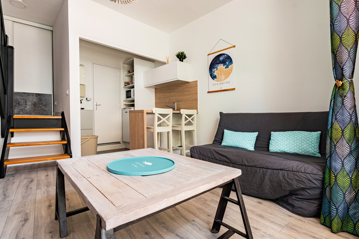 「Les toits de Nazado」是一間舒適明亮的小公寓,位於埃爾基 (Erquy) 中心,安靜且安全的住宅區(二樓,有電梯),地下室設有電源插座。 距離海灘 400 公尺,距離商店 100 公尺。地理位置優越,是徒步旅行 GR34 的絕佳起點。 公寓已經使用優質的材料和傢俱進行了全面翻新。