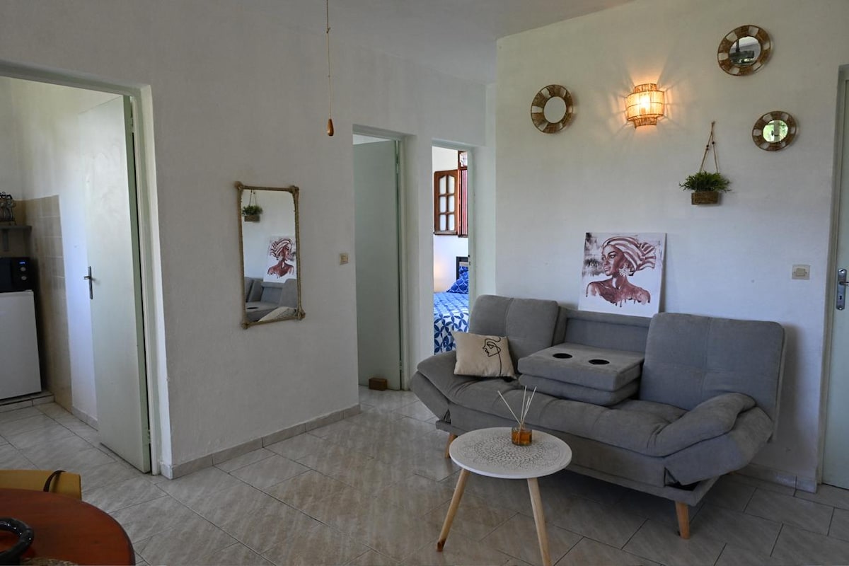 我們的平房配備齊全(配有飲用水箱),封閉式的舒適花園會吸引您。 平房有 2 間空調臥室、1 間獨立廁所、2 間浴室、1 間開放式廚房和 1 個露台,露台上有戶外燒烤區 我來自瓜德羅普島,很樂意與您分享我所有的小祕密。 祝您在安茹克里奧爾度過愉快的假期!