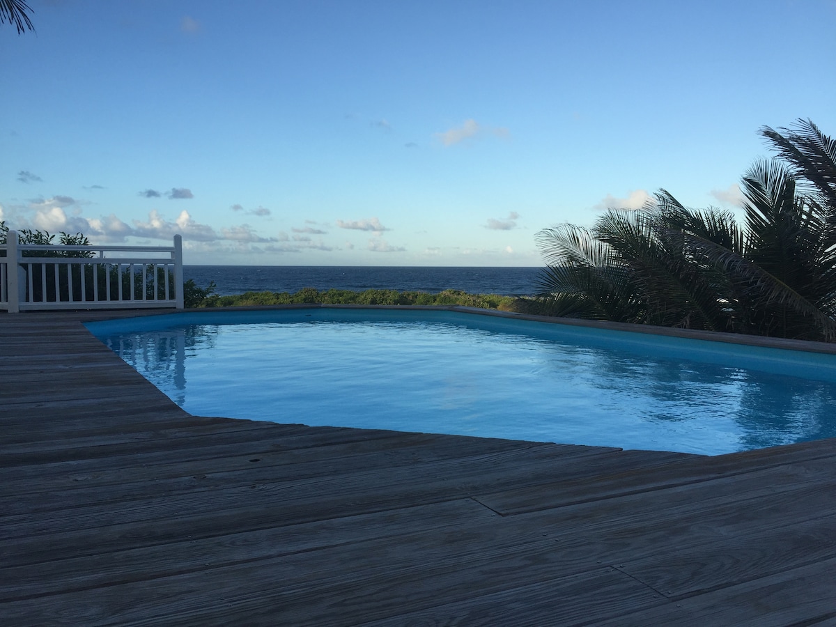 獨立入口的住宿,包括一個大廚房、一個露臺、一個辦公室、2 間臥室和一個浴室。 公寓位於我們的房子內。一面牆是共用的。 克里奧爾花園內的大型無邊泳池。 步行即可抵達聖費利克斯海灘。 您會喜歡這個住所的寧靜、游泳池和神奇的景觀。 您也可以沿著海岸小徑散步,或步行前往麵包店。