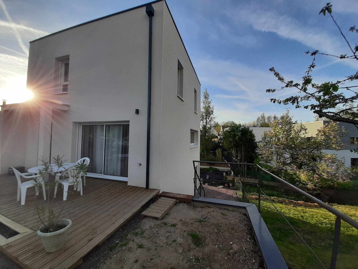 迷人的獨立房屋出租。環境非常安靜。 樓上:2 間臥室(1 張雙人床、1 張雙層床 + 抽屜床)。1 間帶大淋浴間的浴室和 1 間獨立廁所。 一樓:客廳、起居室和廚房。 花園(1000 平方公尺)。 提供床單和毛巾。 停車場在封閉式庭院內。 距離超市 50 公尺。 距離綠道、休閒中心和餐廳 800 公尺。 距離卡昂(Caen)15分鐘,距離海灘40分鐘,距離聖米歇爾山(Mont Saint Michel)1小時。 10 分鐘內即可抵達所有商店。
