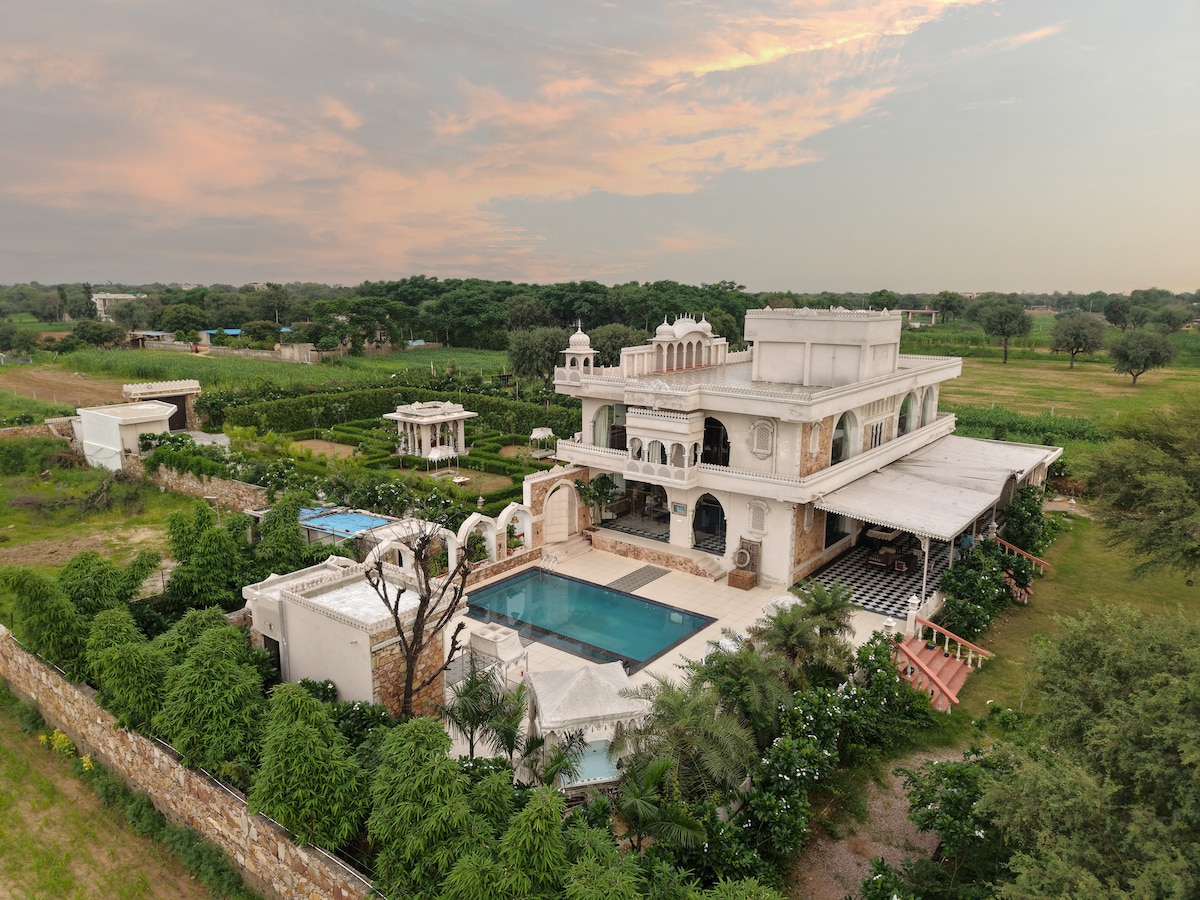 這是一座豪華的私人農舍,坐落在斋浦爾附近寧靜的鄉村地帶,非常適合放鬆身心的度假、家庭假期和私密慶祝活動。此物業設有 5 間寬敞的睡房,每間均附有浴室;此外還有私人泳池、時尚的室內休息區、撞球桌,以及美麗的室外景觀空間,非常適合與家人和朋友一起放鬆身心。專屬廚師和助手全天候提供服務,並包括新鮮烹製的早餐,讓您的住宿體驗更加舒適便利。