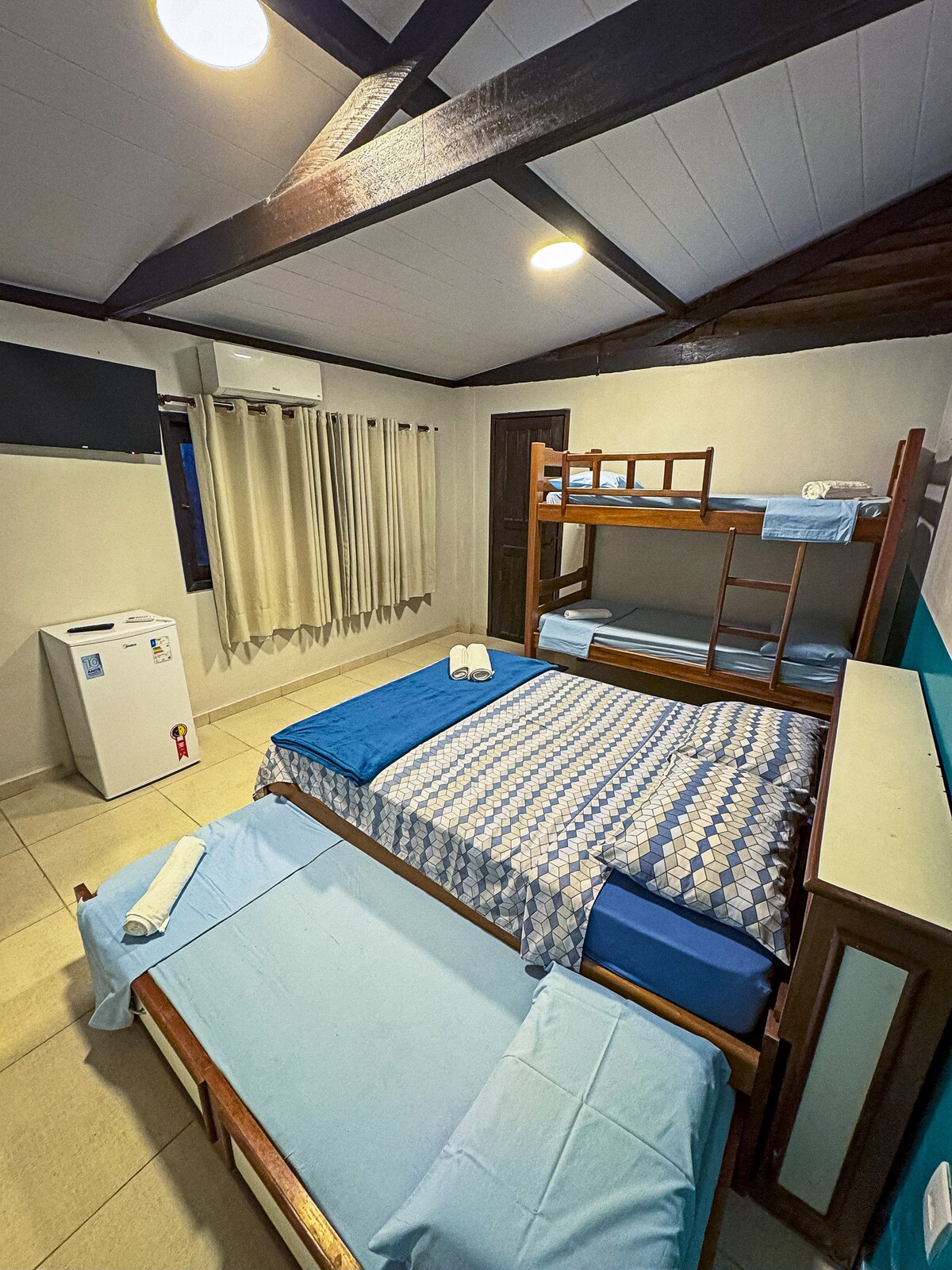 Relaxe com toda a família nesta acomodação tranquila. Suítes com 1 cama de casal e 2 de solteiro, frigobar, ar, módulo para closed com cabideiro, condicionado e um par de escápulas... áreas compartilhadas como Cozinha, Garagem, Sala....