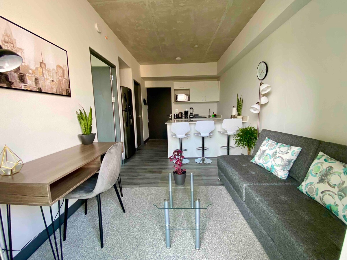 Take a morning stroll in the park before heading back to your centrally-located, industrial 2 br apartment that will welcome you with high-speed wifi, top-of-the-line kitchen appliances, amazing decor, comfortable beds, and sunset views from a 12th floor overlooking the city. Not only will you have access to unparalleled amenities like a semi-Olympic pool, saunas, gym, and co-working space, you will be a walking distance from the best restaurants, coffee shops, and grocery stores in town.