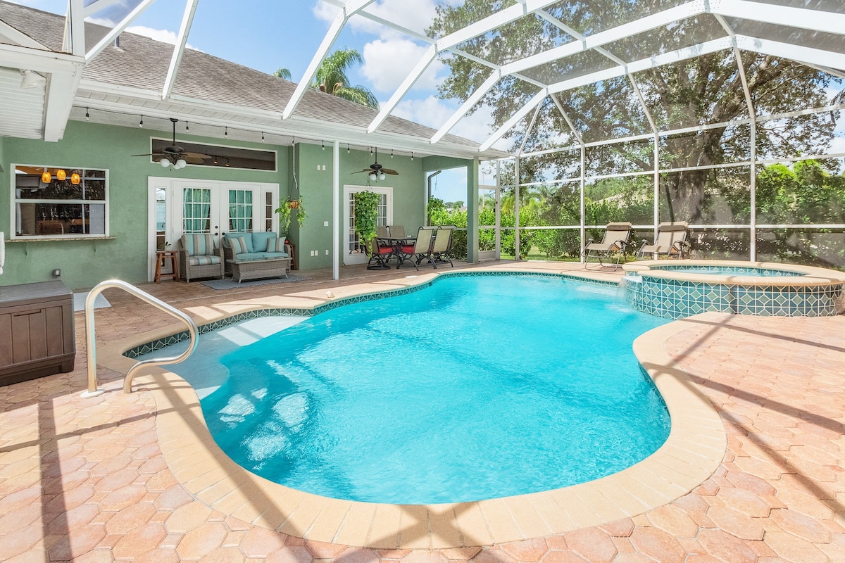 -5 min to Downtown Cape/10 min to Yacht Club Beach, 20 min to Causeway Beach, 25 min to Ft Myers & Sanibel Beach -Tropical private backyard w/ pool, hot tub, gas firepit, swing chair, hammock & Blackstone grill -Beach essentials, boogie boards, umbrellas, beach wagon, cooler & chairs -Board games, ping-pong, corn-hole, darts, 2 kayaks+life jackets -2 Beach Cruiser bikes + helmets -Relaxing enclosed covered patio + string lights, neon sign & grass wall -Canal access for kayak launch 5 min away